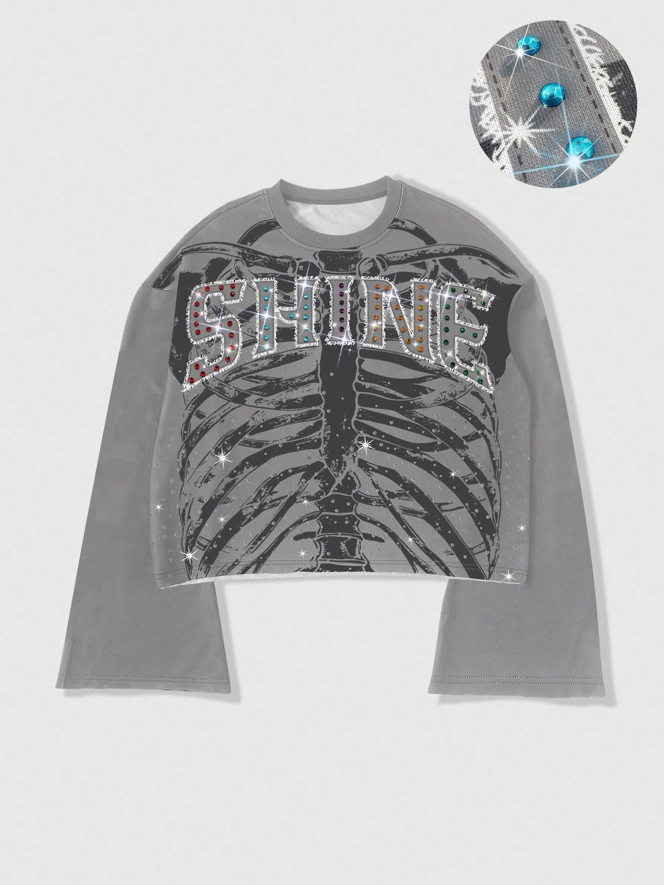 Goth Men Bone Pattern Rhinestone Decor Round Neck Long Sleeve T-Shirt, Fall