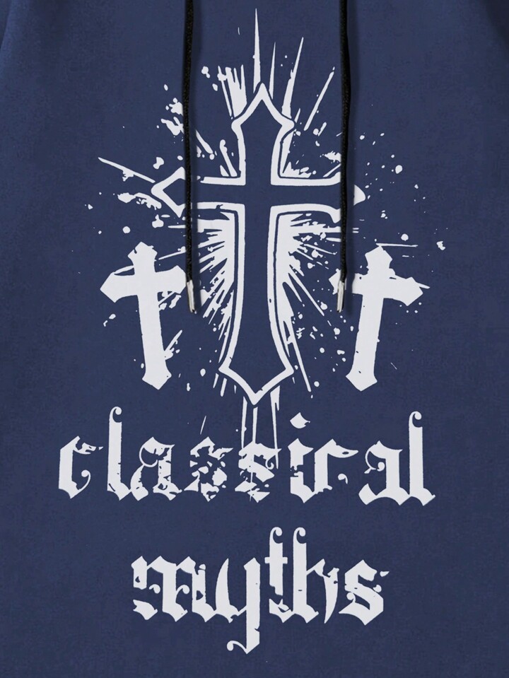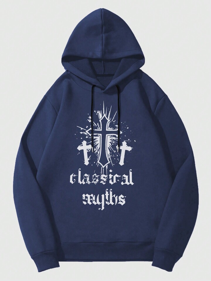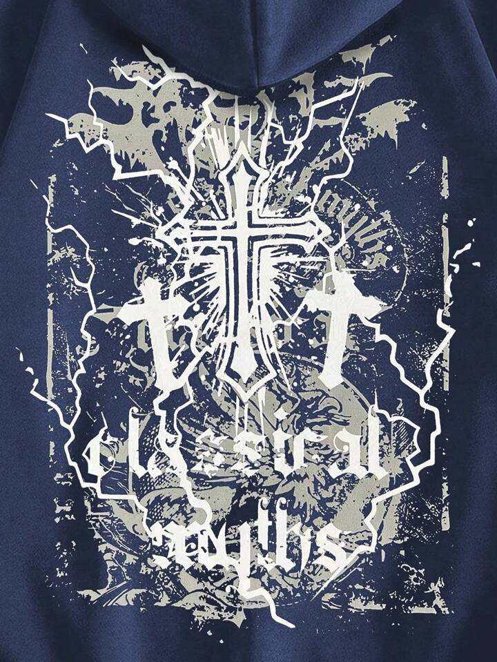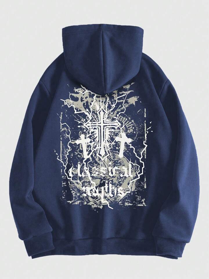 Goth Men Cross & Letter Graphic Drawstring Thermal Lined Hoodie