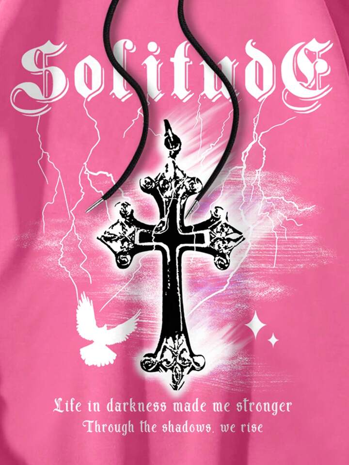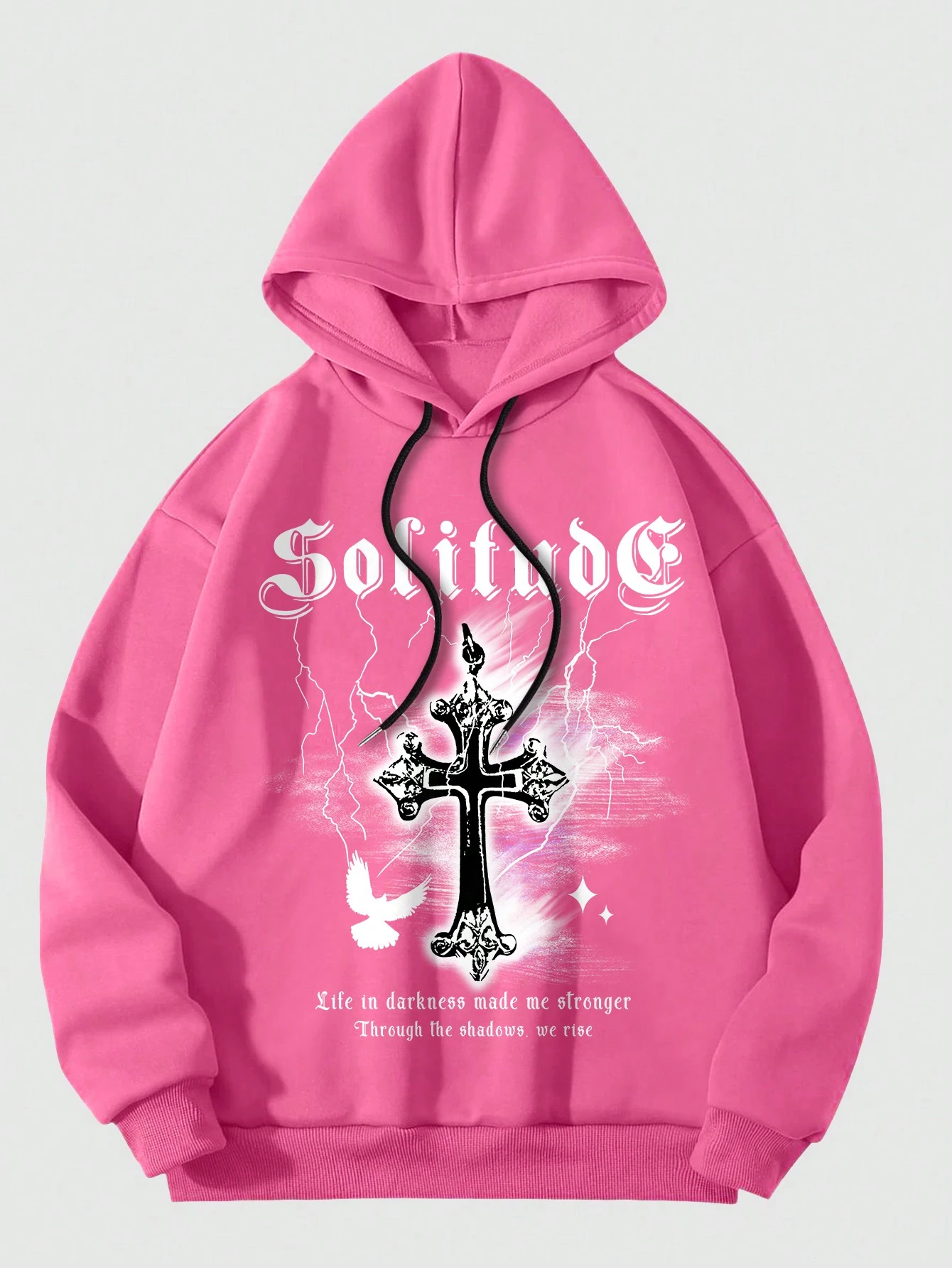 Goth Men Slogan & Cross Graphic Drawstring Thermal Lined Hoodie