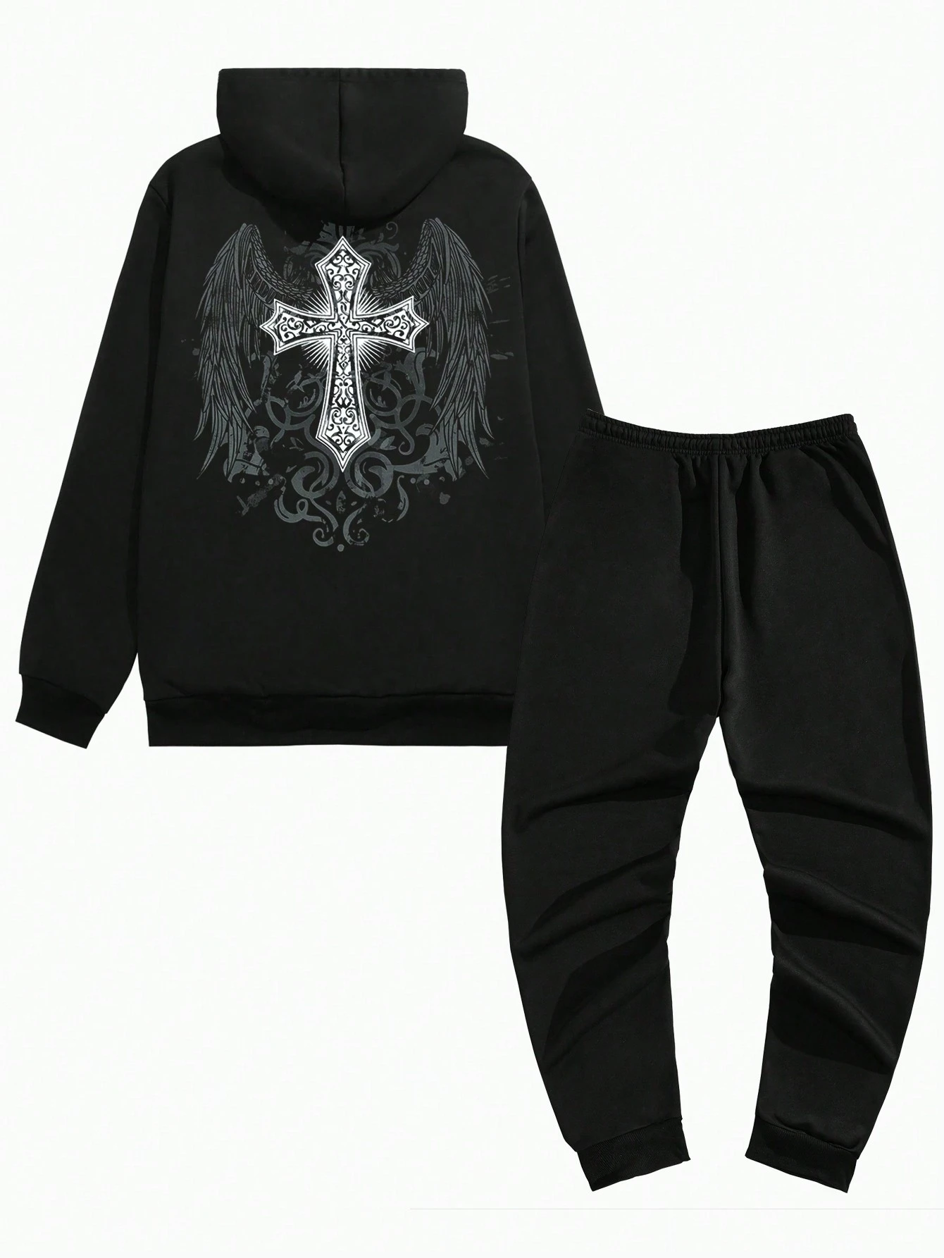 Goth Men Wing Print Hooded Sweatshirt & Sweatpants Set