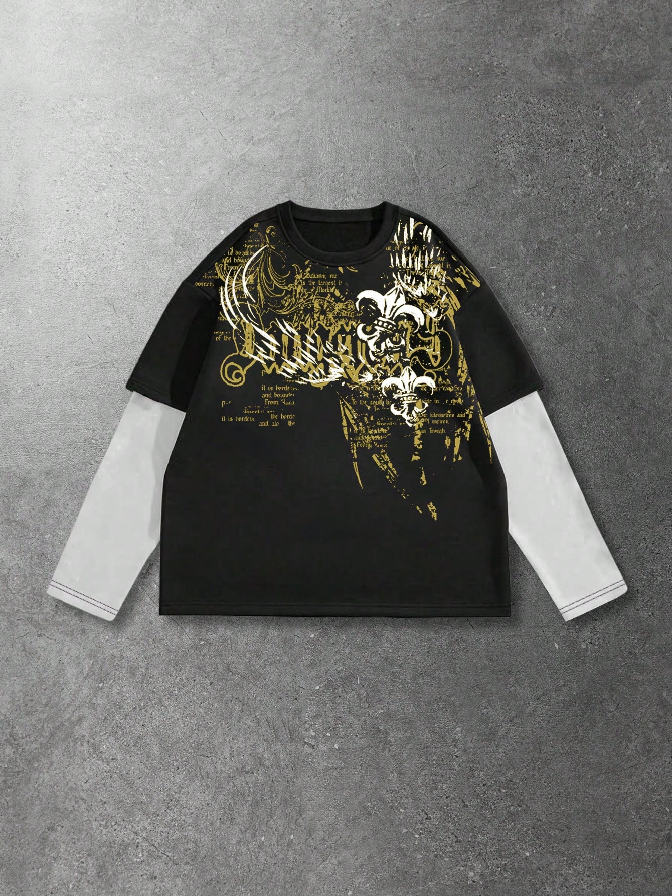 Goth Men's Casual Fashionable Street Slogan Print Contrast Color Long Sleeve 2 In 1 T-Shirt, Spring/Autumn