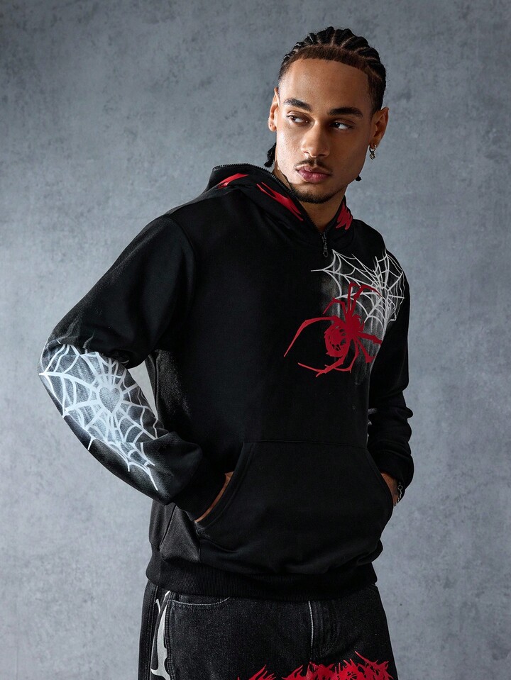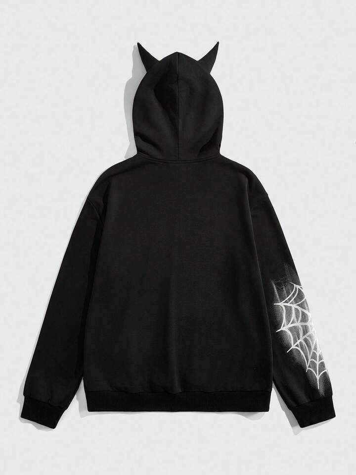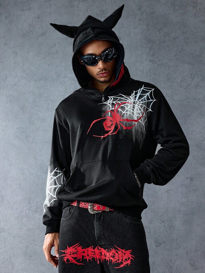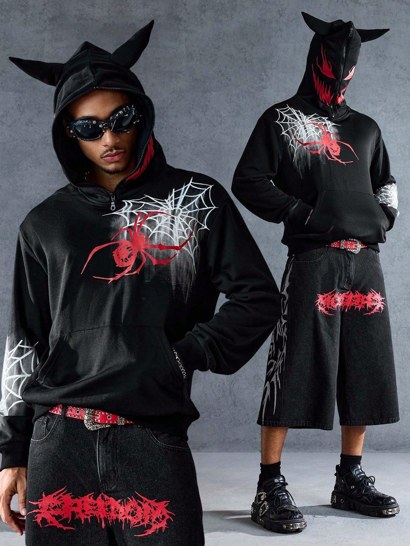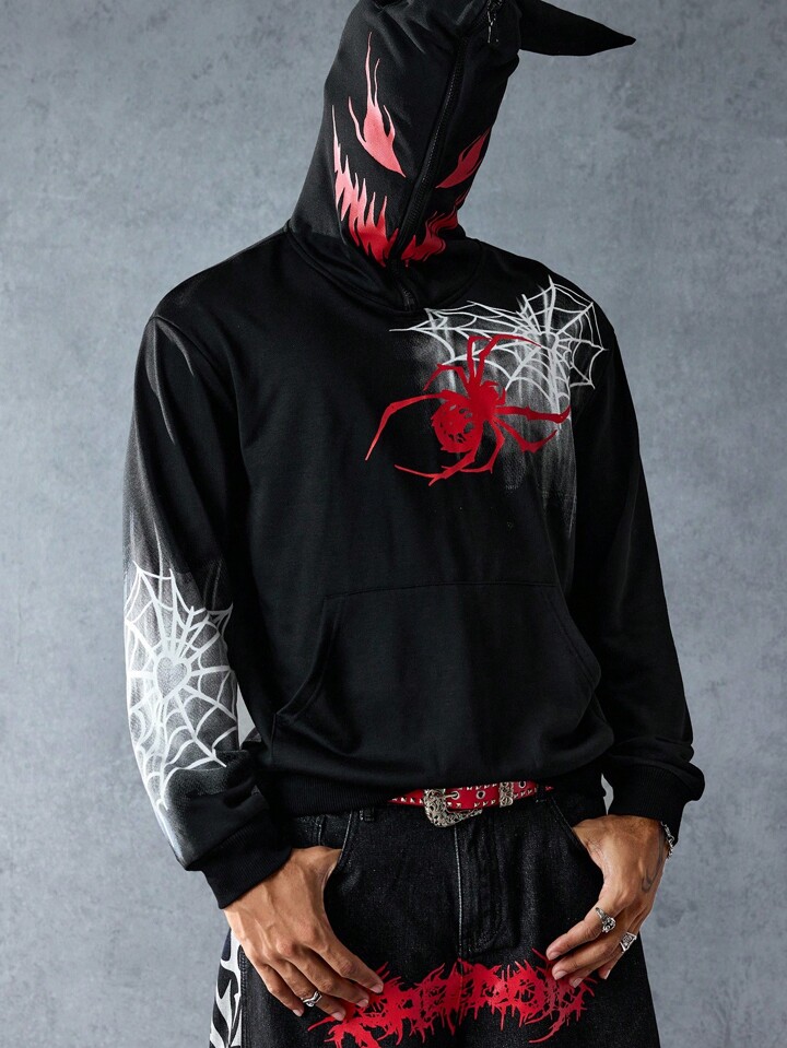 Goth Men's Fashion Spider Web Print Asymmetric Hoodie, Halloween