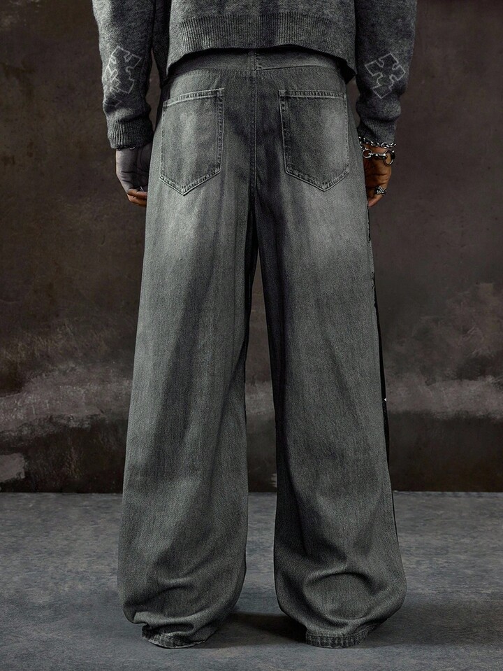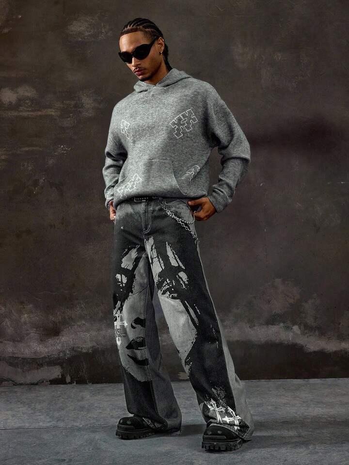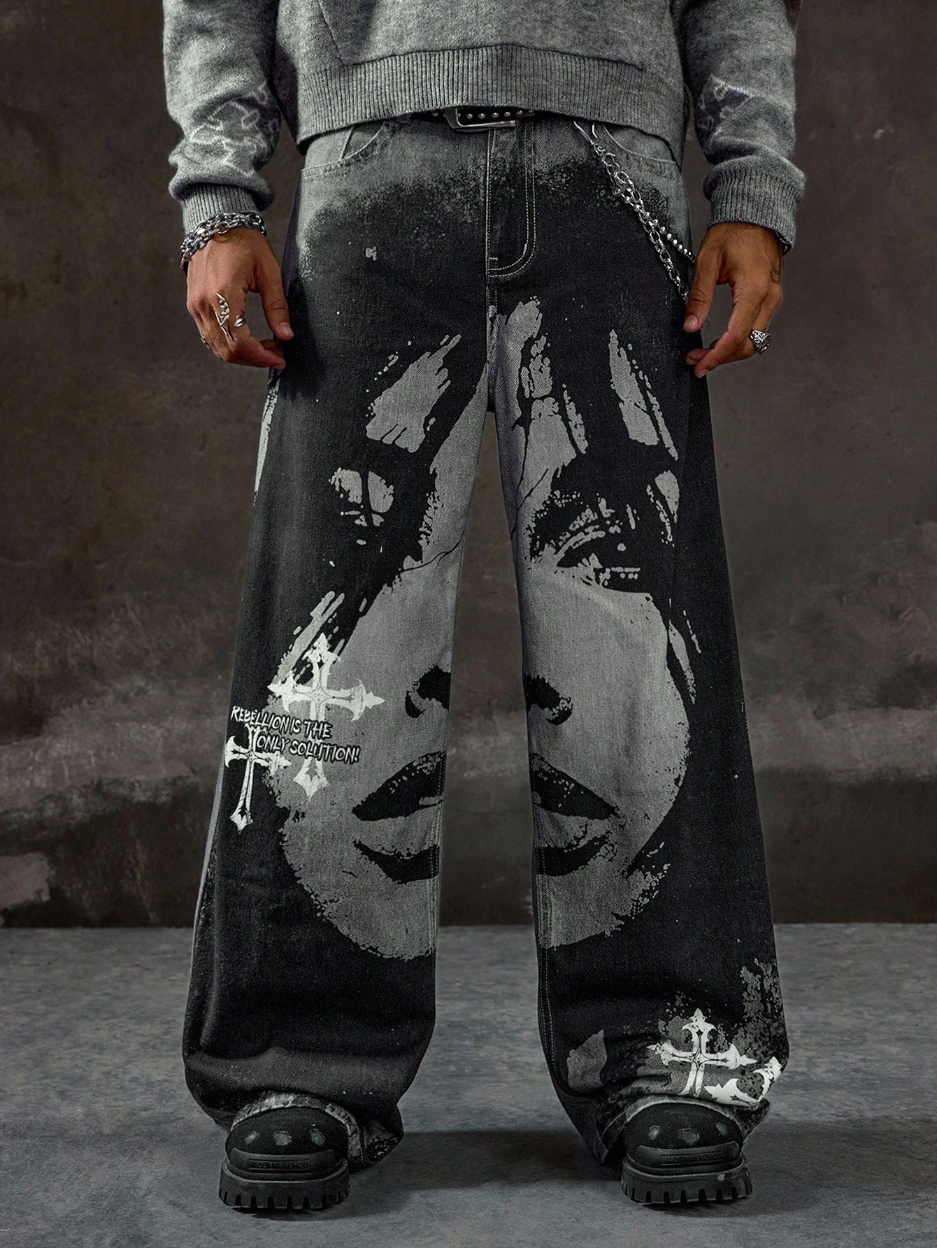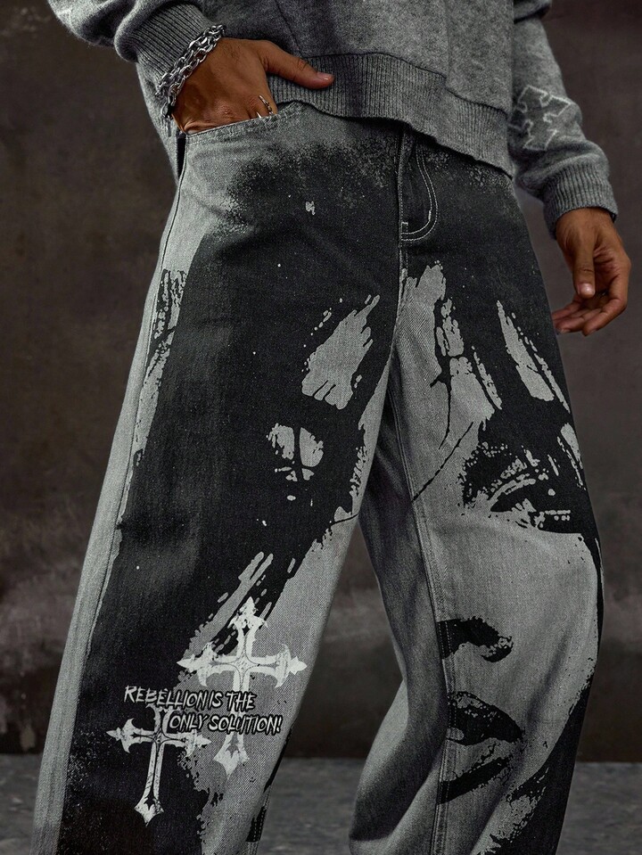 Goth Men's Loose Street Style Cross Character Print Jeans Halloween