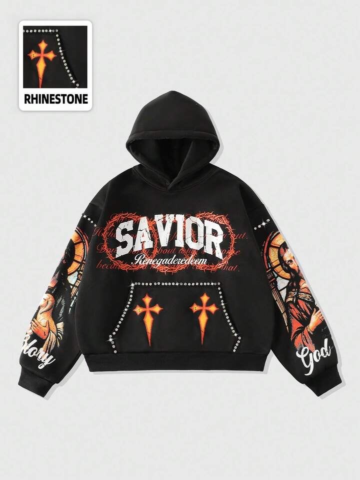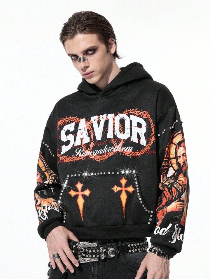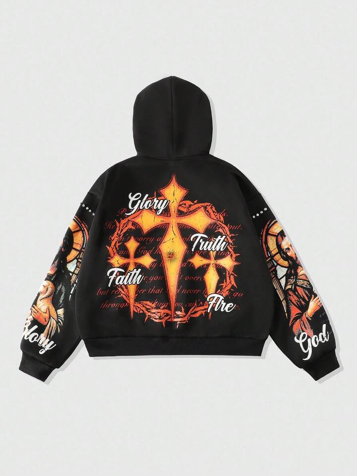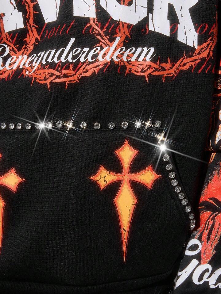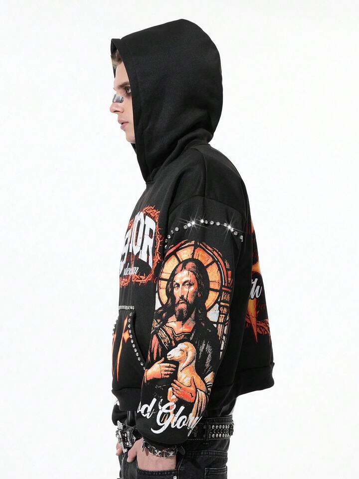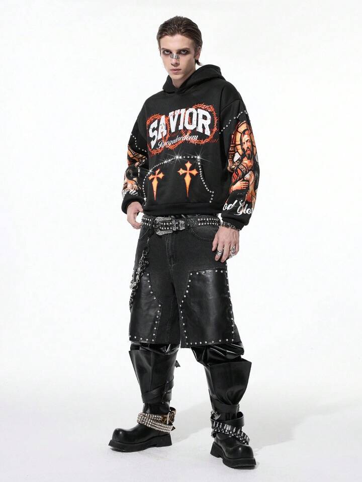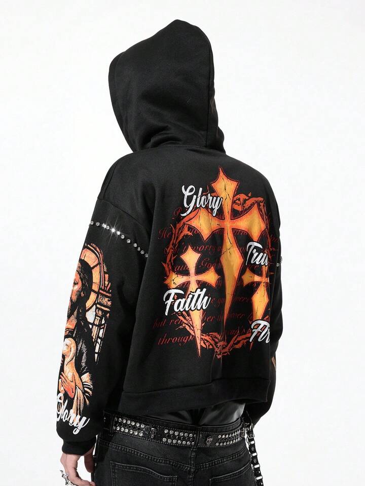 Goth Men's Sparkling Diamond Cross Print Hoodie, Loose Cropped Style, Fall Winter
