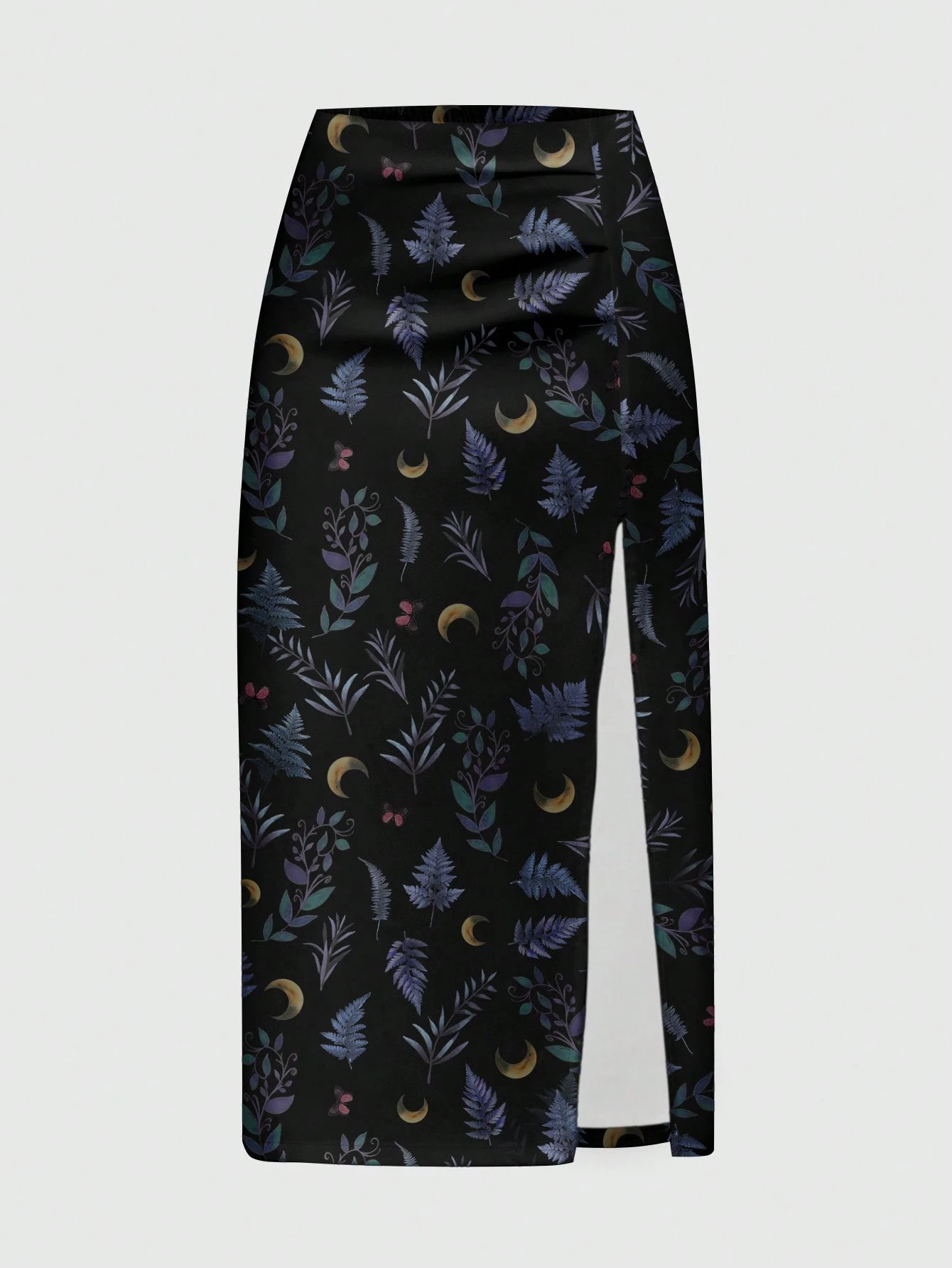 Goth Mori Style Dark Mushroom, Sun, Moon, Star, Leaf & Fern Print High Slit Skirt For Women