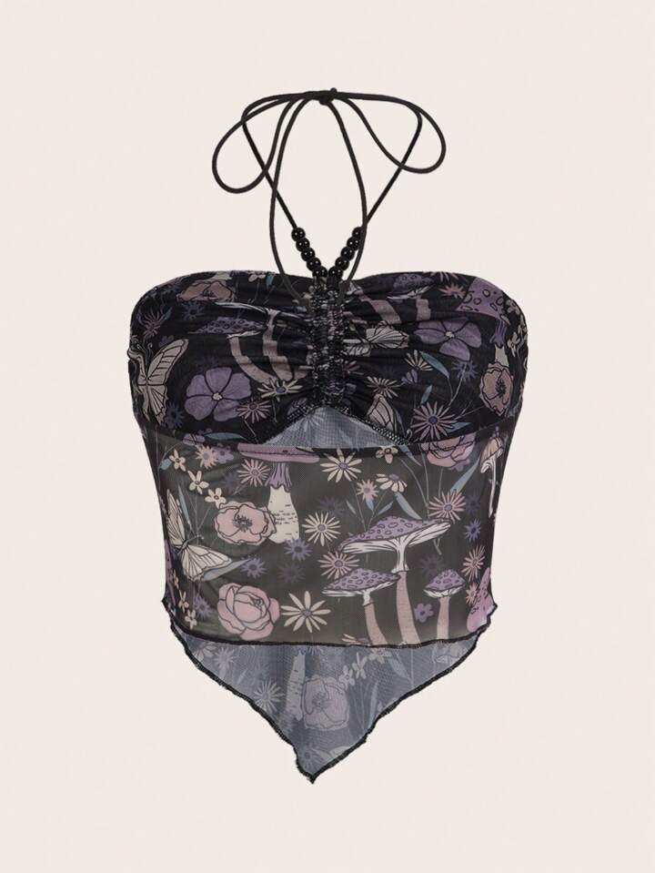 Goth Mushroom Print Bandana Hem Crop Mesh Halter Top