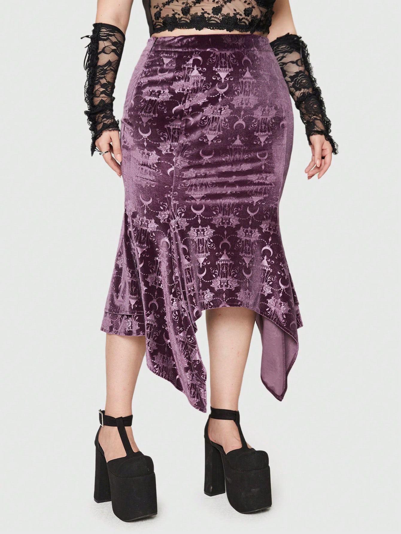 Goth Plus Allover Print Asymmetrical Hem Velvet Skirt