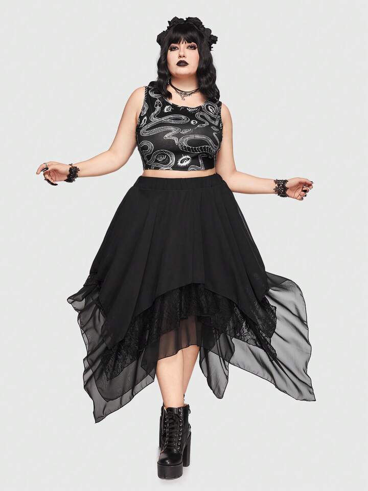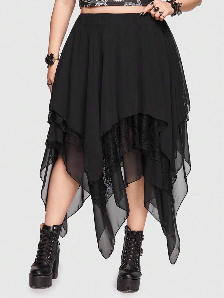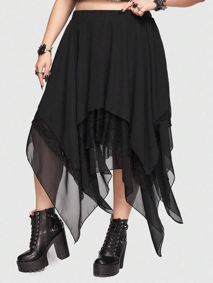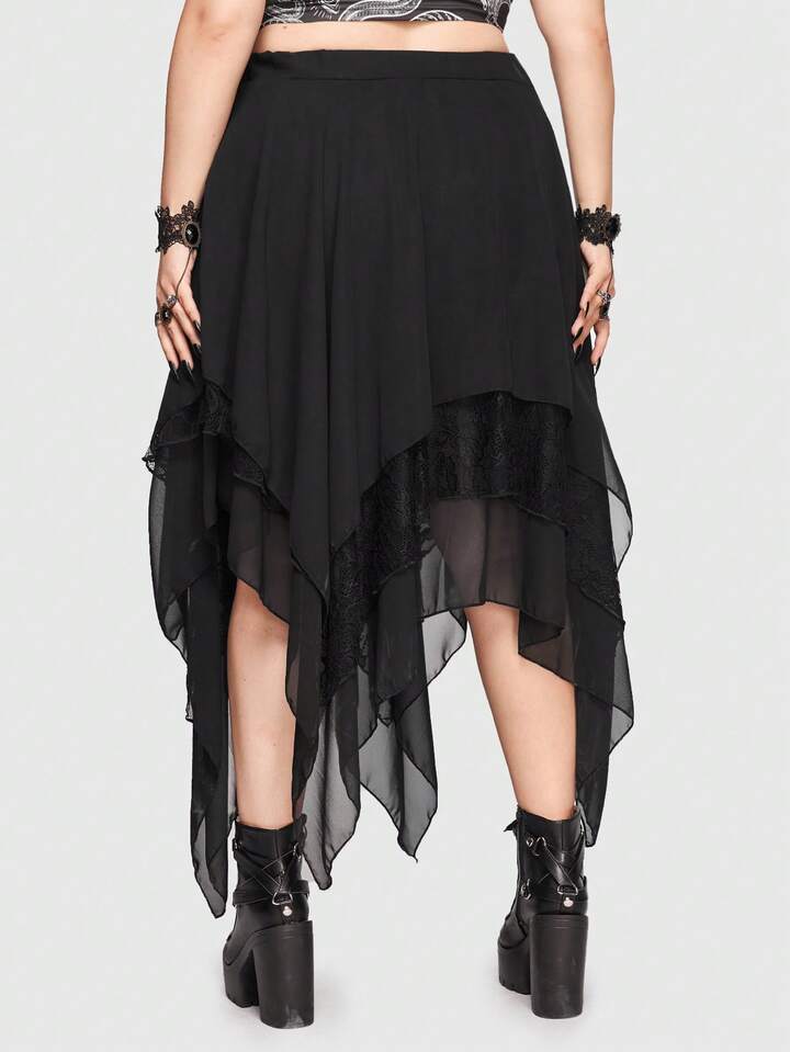 Goth Plus Contrast Lace Asymmetrical Hem Chiffon Skirt