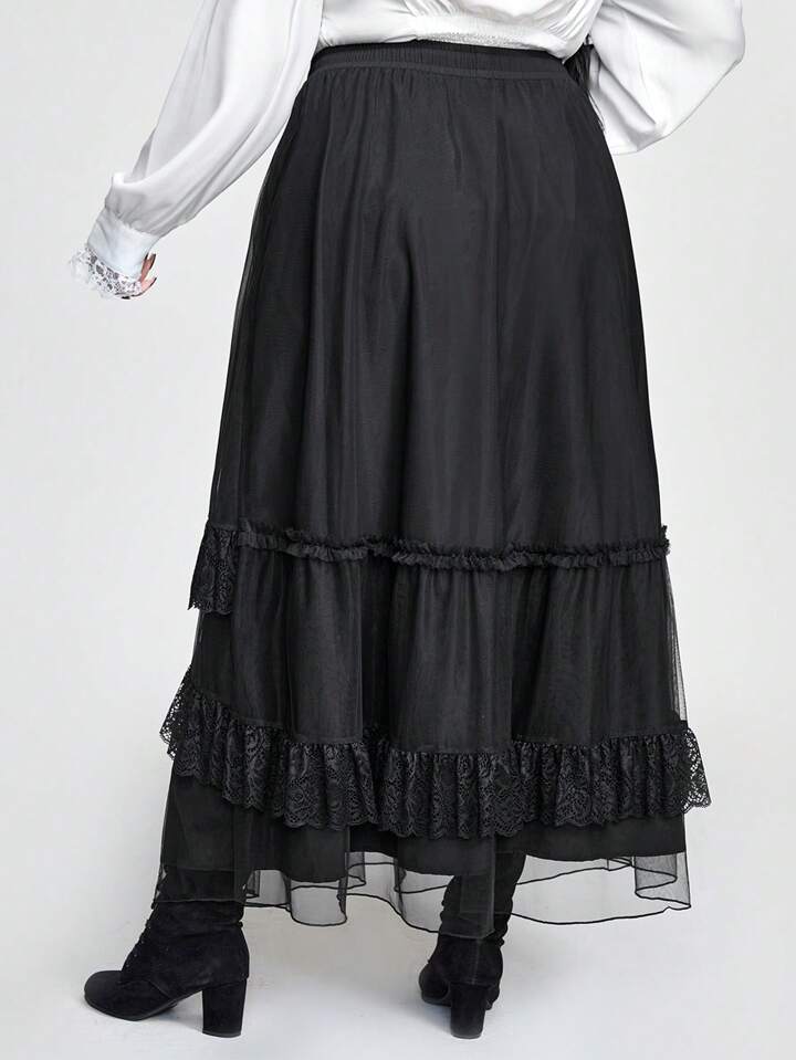 Goth Plus Size Elastic Waist Layered Ruffles Lace Mesh Black Mid-Length Skirt