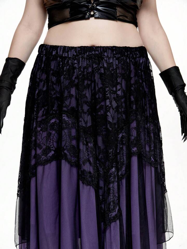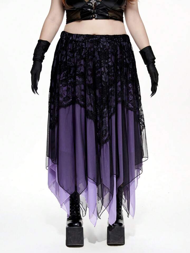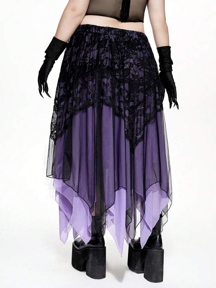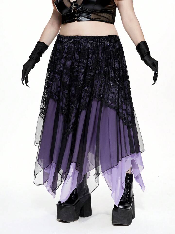 Goth Plus Size Elegant Romantic Lace Trim Asymmetric Hem Elastic Waist Skirt