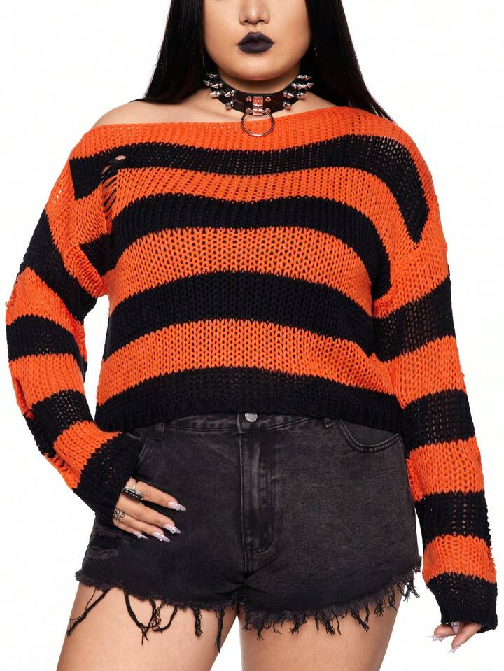 Goth Plus Size Oblique Shoulder Black & Orange Striped Distressed Pullover Sweater