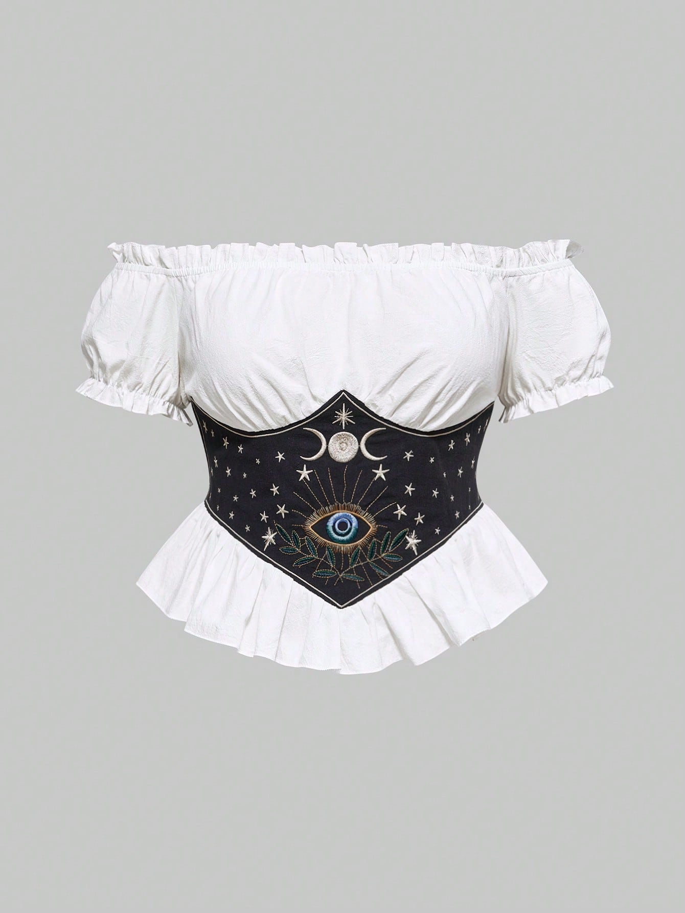 Goth Plus Size One Shoulder Vintage Star & Moon Mystical Eye Embroidery Patchwork Waist Drawstring Shirt