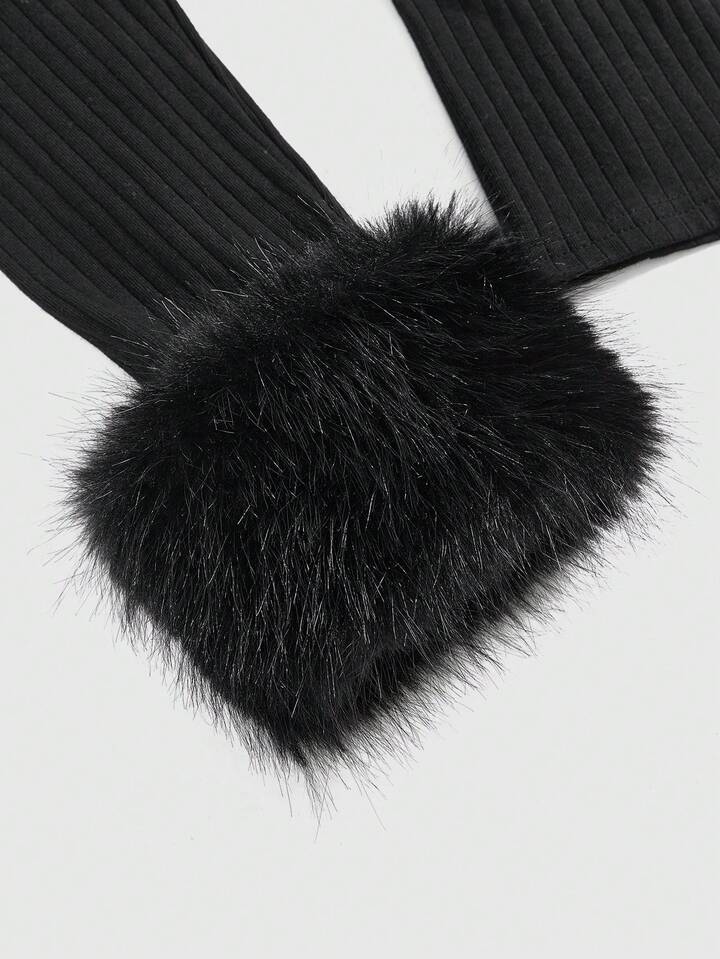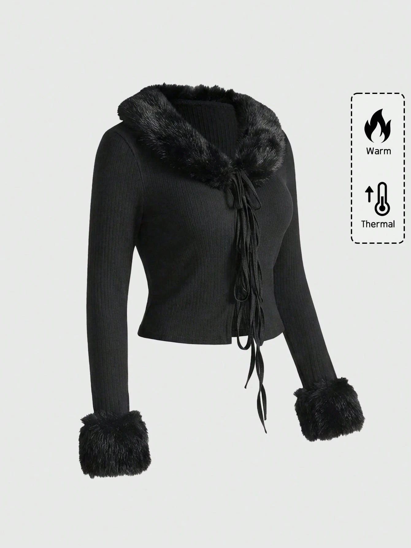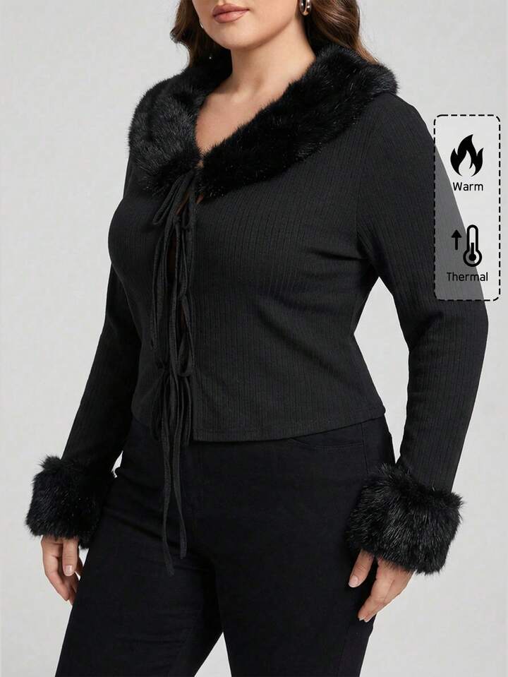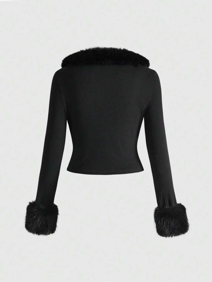 Goth Plus Size Women Black Knit Sweater With Fuzzy Collar And Cuffs, Casual Daily Wear Plus Size Women Black Knit Sweater With Fuzzy Collar, Casual Daily Wear Plus Size Women Black Knit Cardigan, Casual Street Style