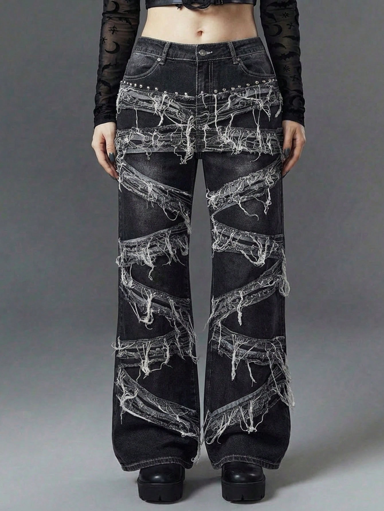 Goth Plus Size Women Grunge-Punk Casual Fashion Street Style Rivet Frayed Washed Denim Jeans, Autumn/Winter