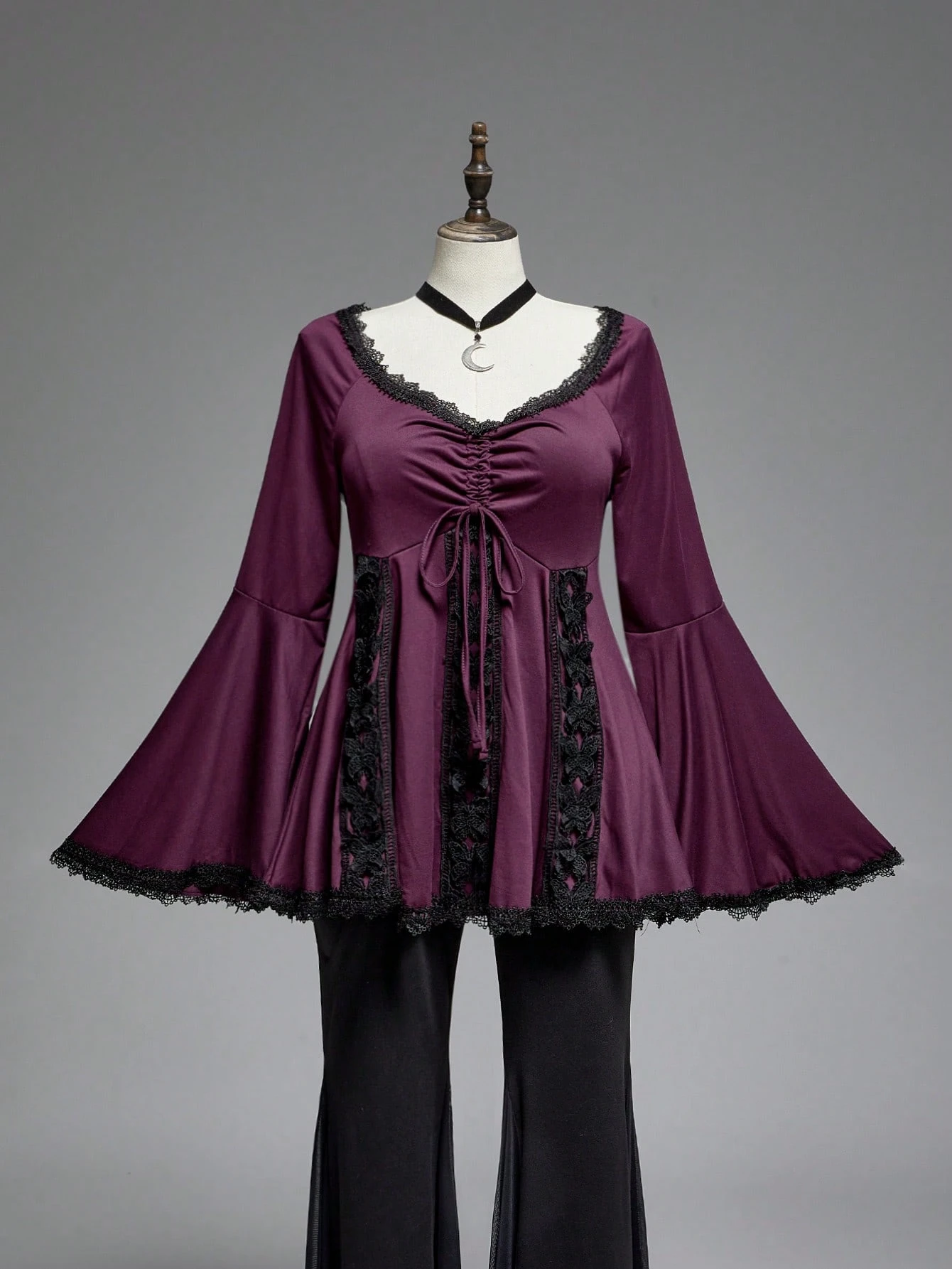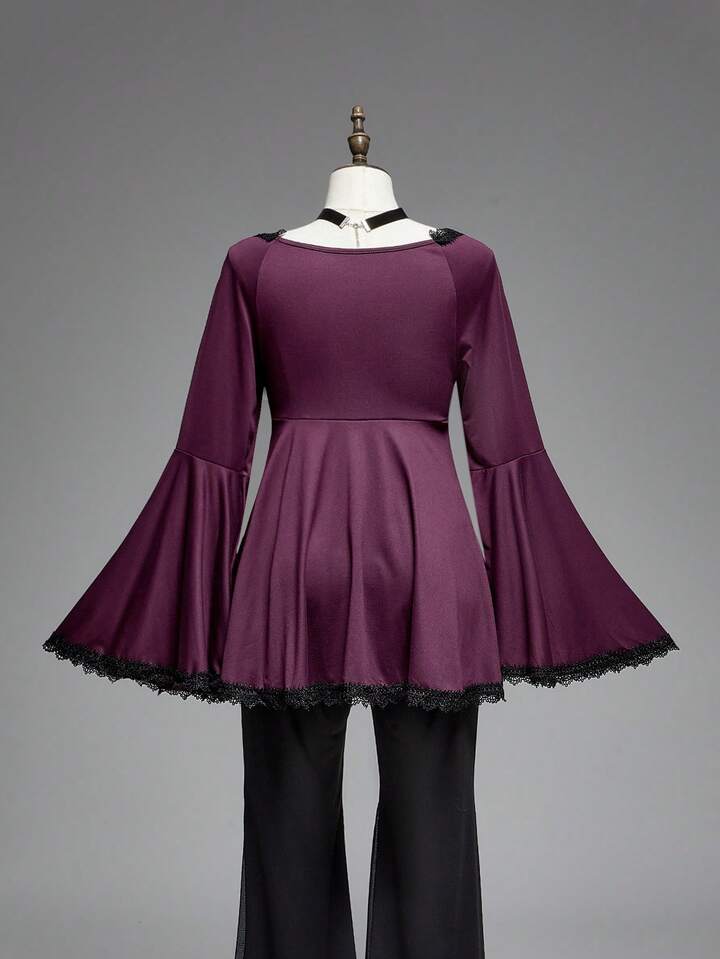 Goth Plus Size Women Halloween Lace Trim Hollow Out Flare Sleeve T-Shirt, Renaissance Style Top
