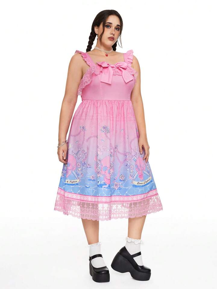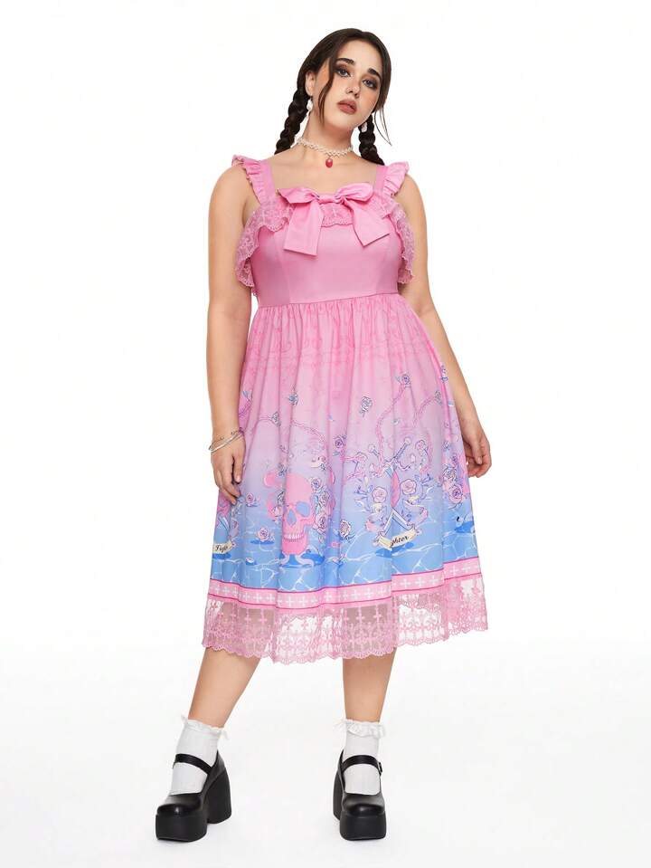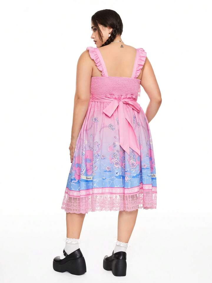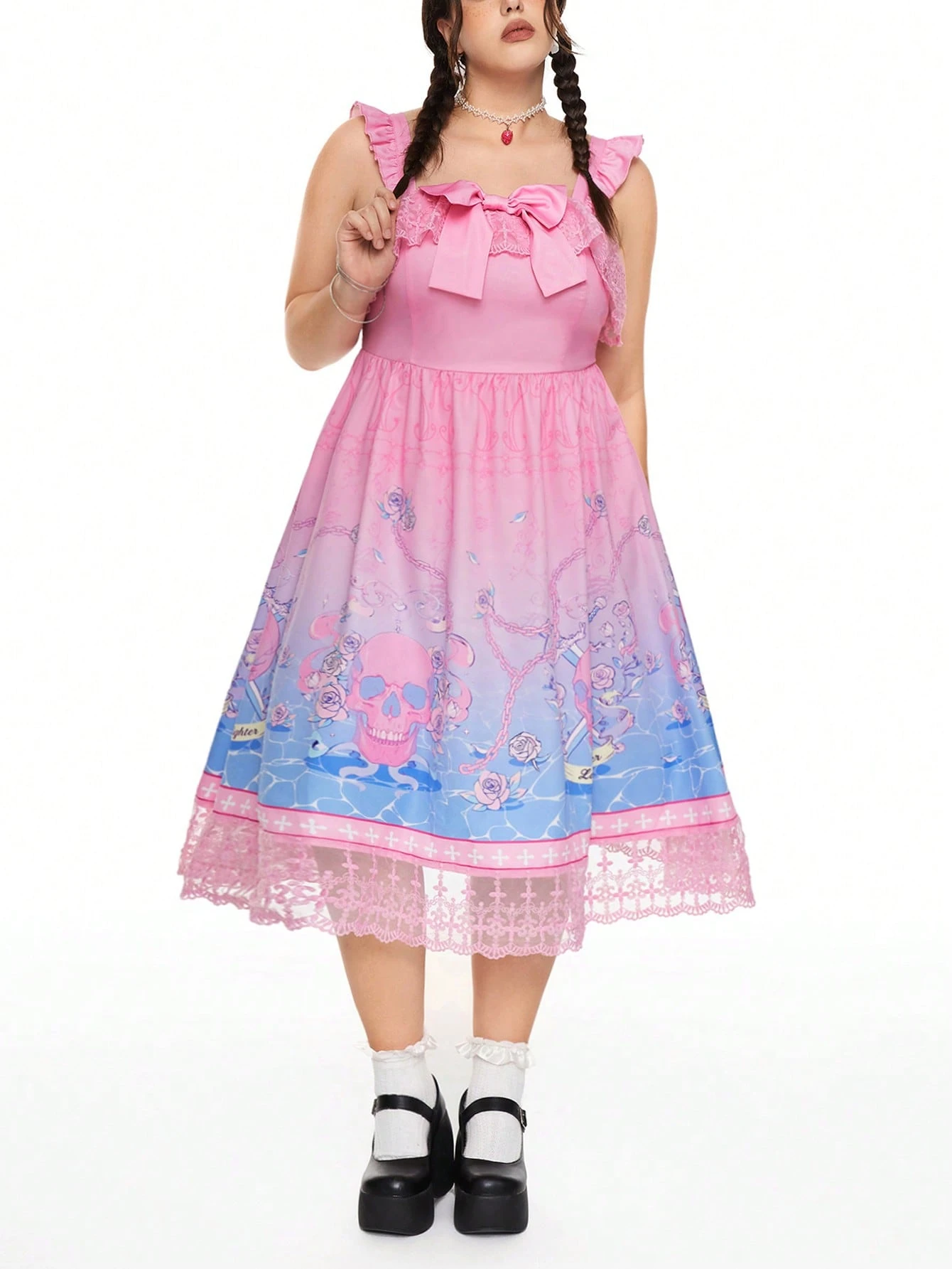 Goth Plus Size Women Skull Print Ruffle Hem Twist Front Elegant Dress