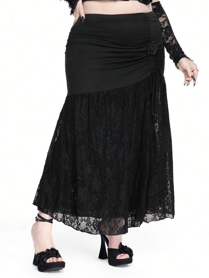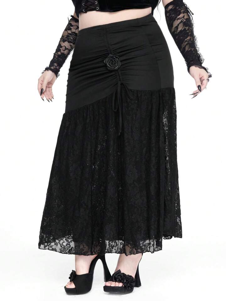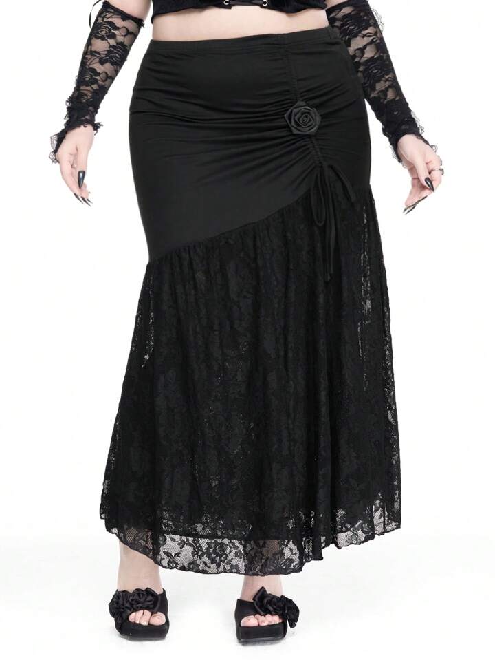 Goth Plus Size Women's Lace Splice Ruched Tied Bow See-Through Sexy Skirt, Party/Ball Gown