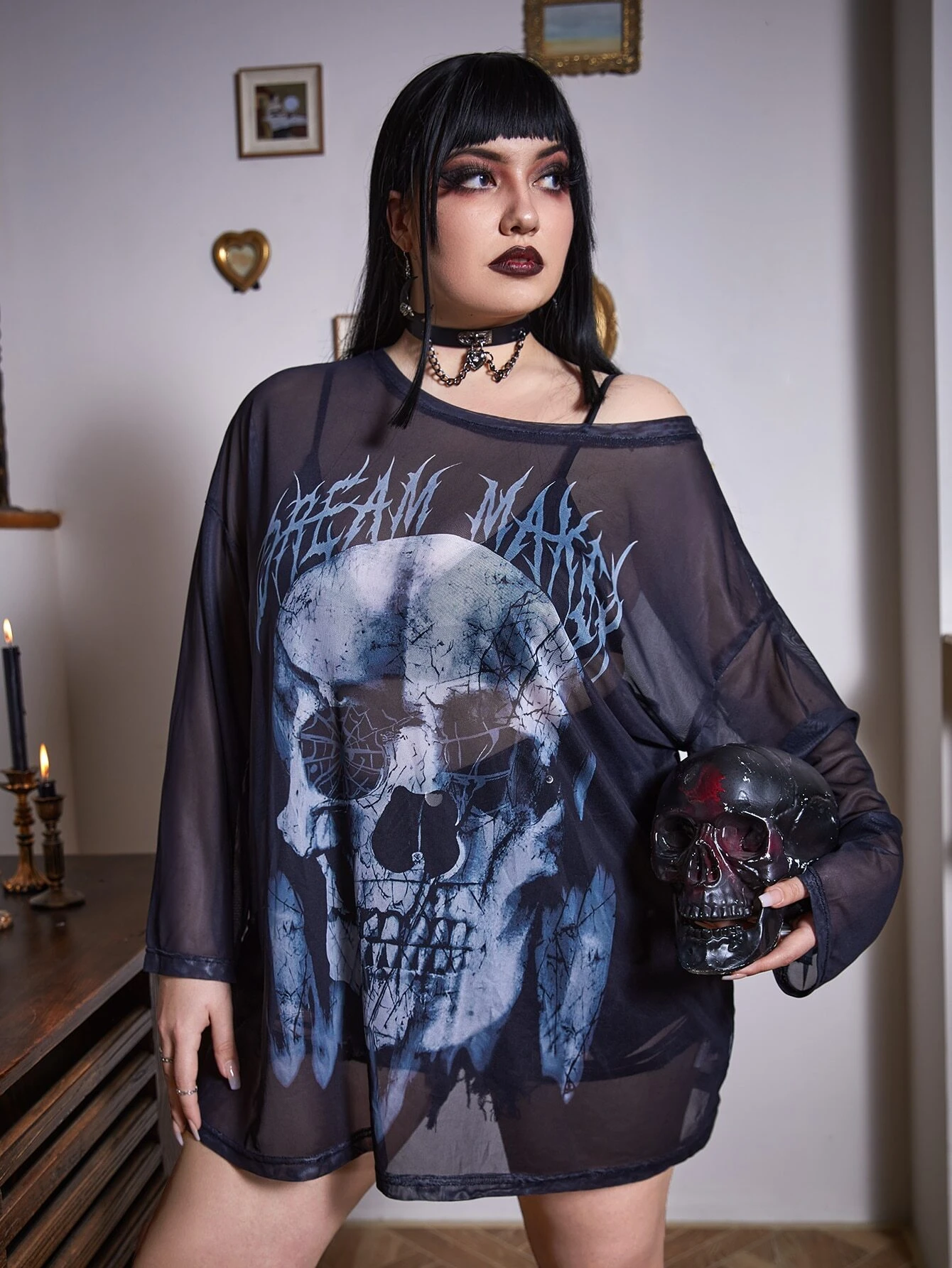 Goth Plus Skull & Letter Graphic Asymmetrical Neck Mesh Top Without Bra