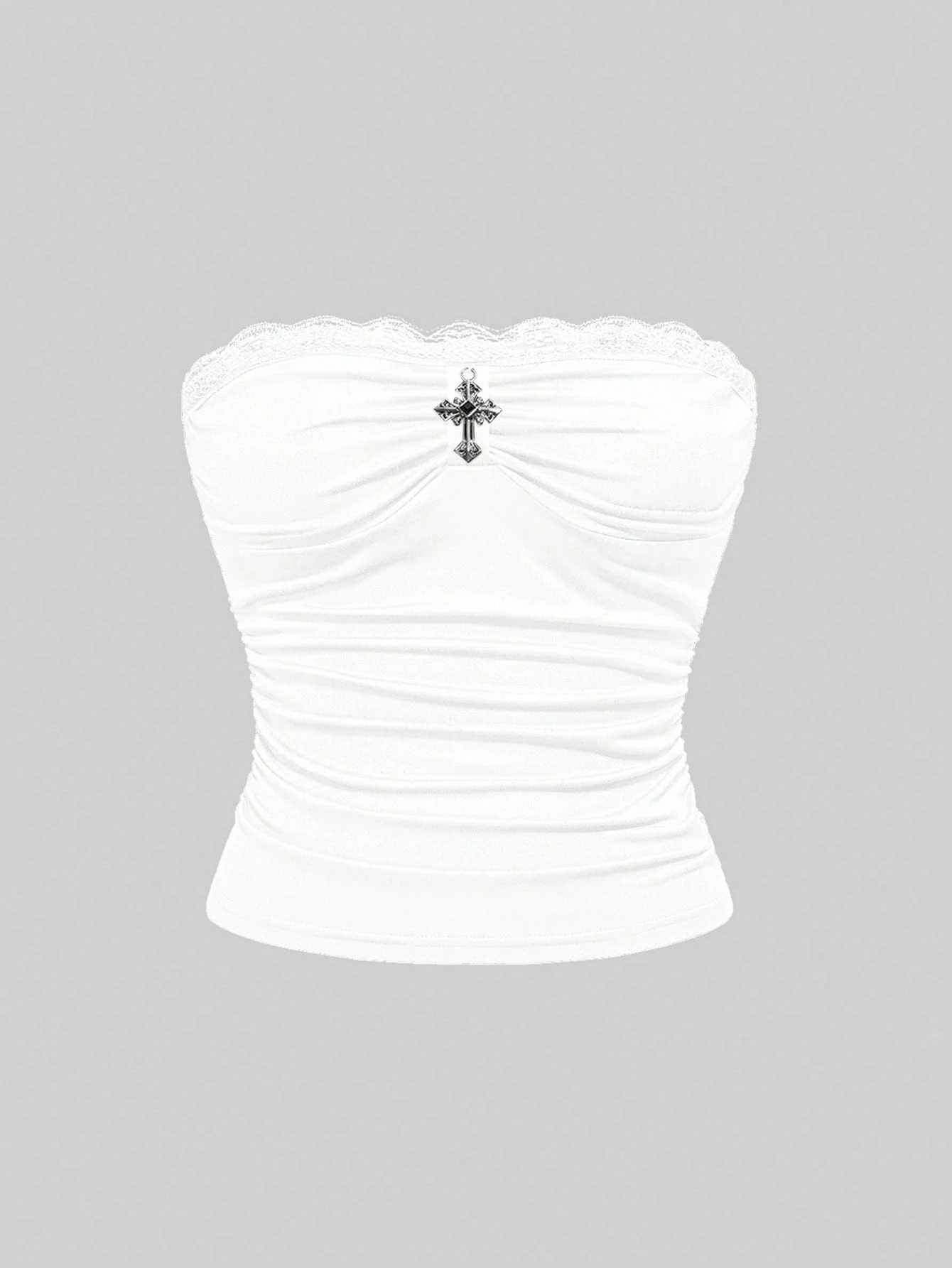 Goth Sexy Casual Lace Trim Metal Cross Decor Tight-Fitting Camisole Top