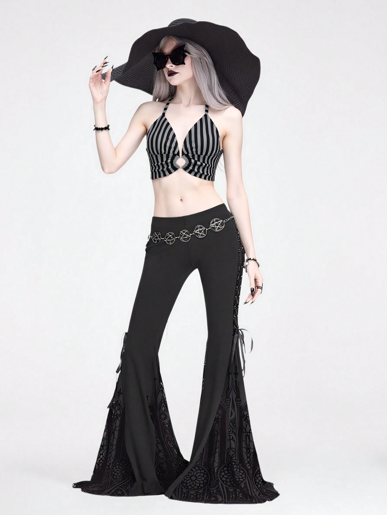 Goth Sexy Vacation Style Halter Neck Black & White Striped Metal Hoop Decor Tank Top