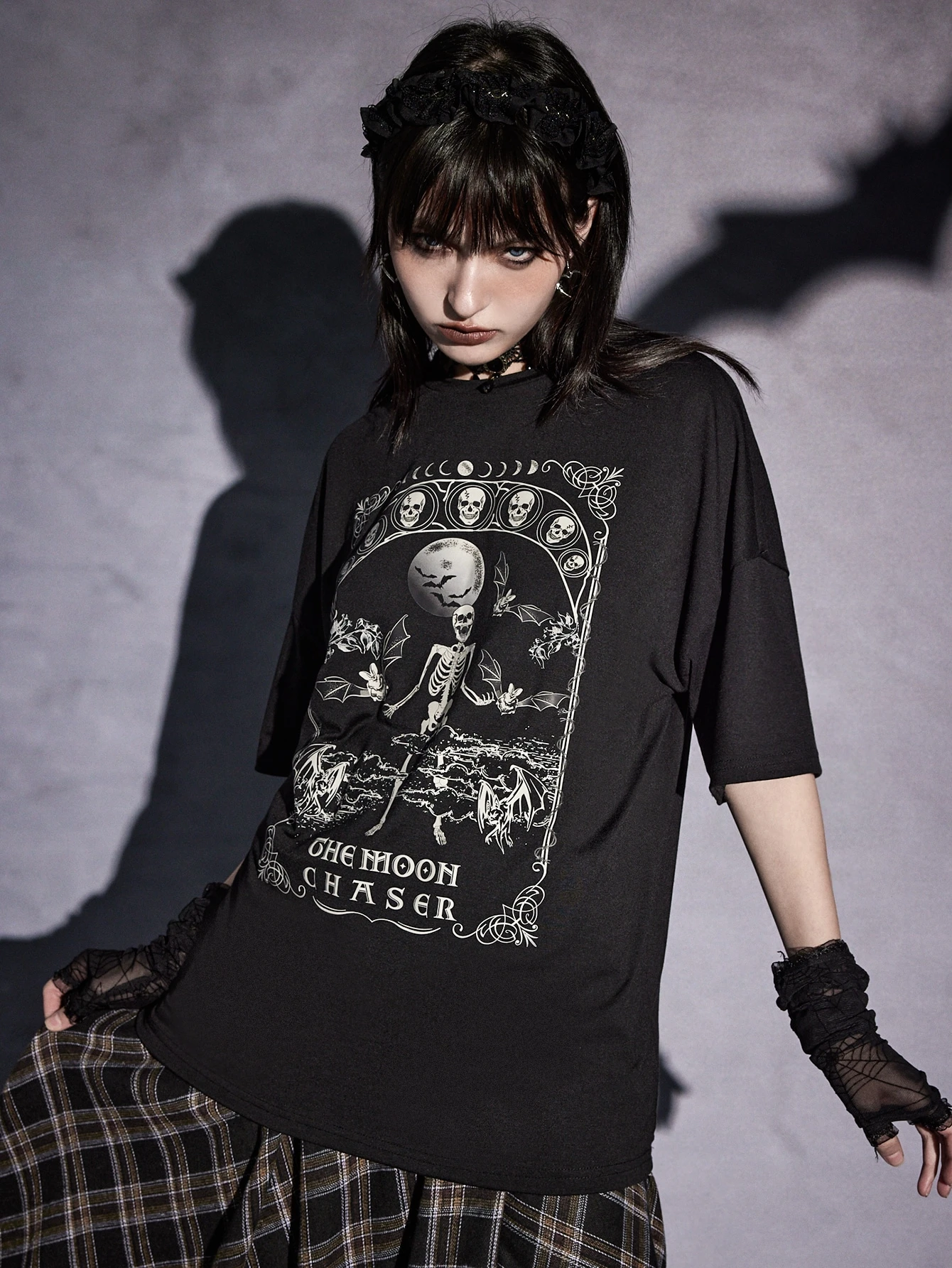 Goth Skeleton & Letter Graphic Drop Shoulder Tee