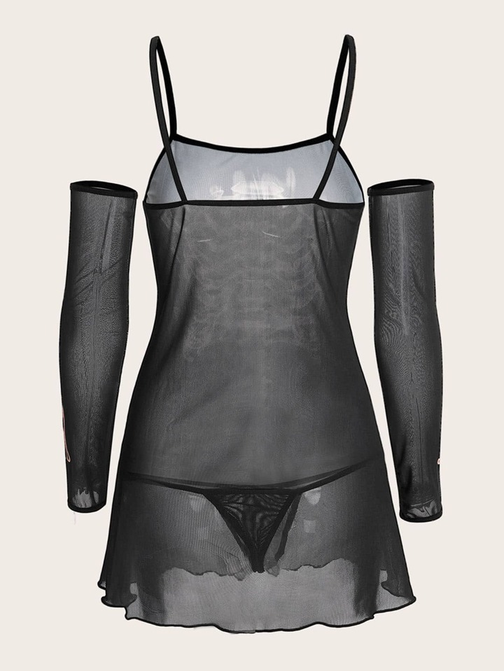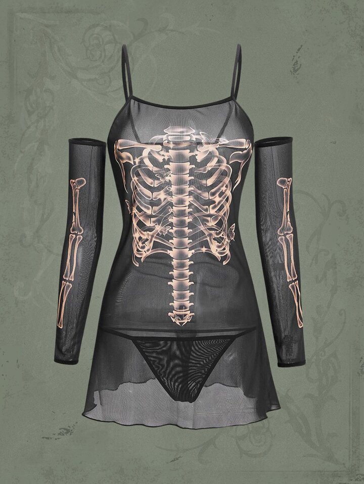 Goth Skeleton Print Mesh Slips With Thong & 1pair Oversleeves