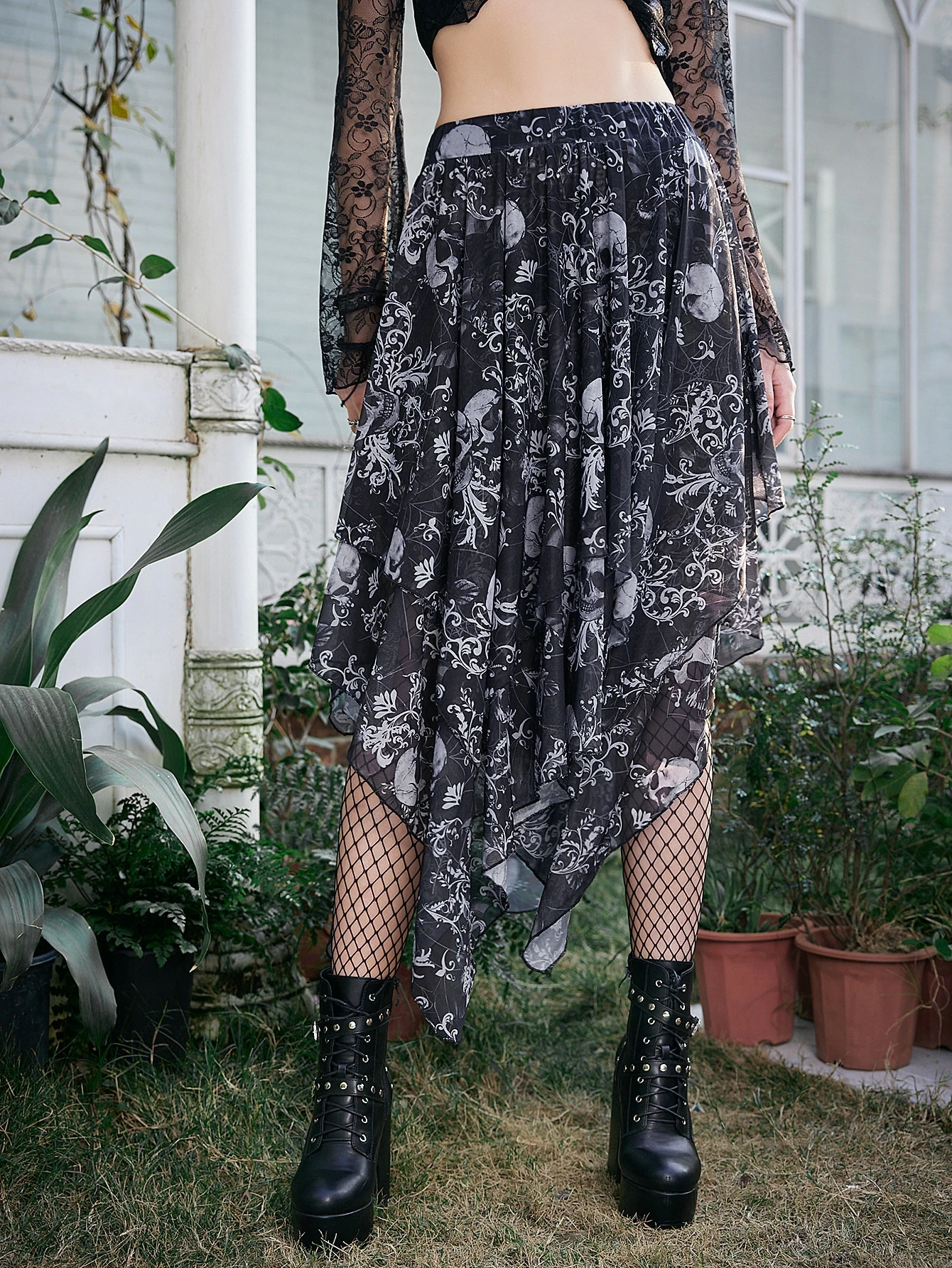 Goth Skull Print Asymmetrical Hem Mesh Skirt