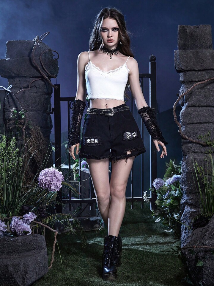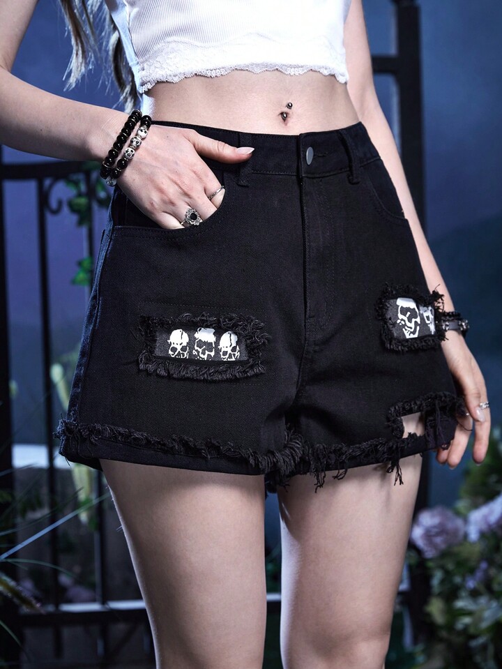 Goth Skull Print Ripped Raw Hem Denim Shorts