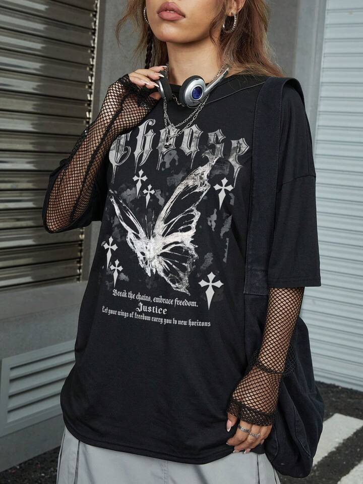 Goth Slogan & Butterfly Print Drop Shoulder Tee