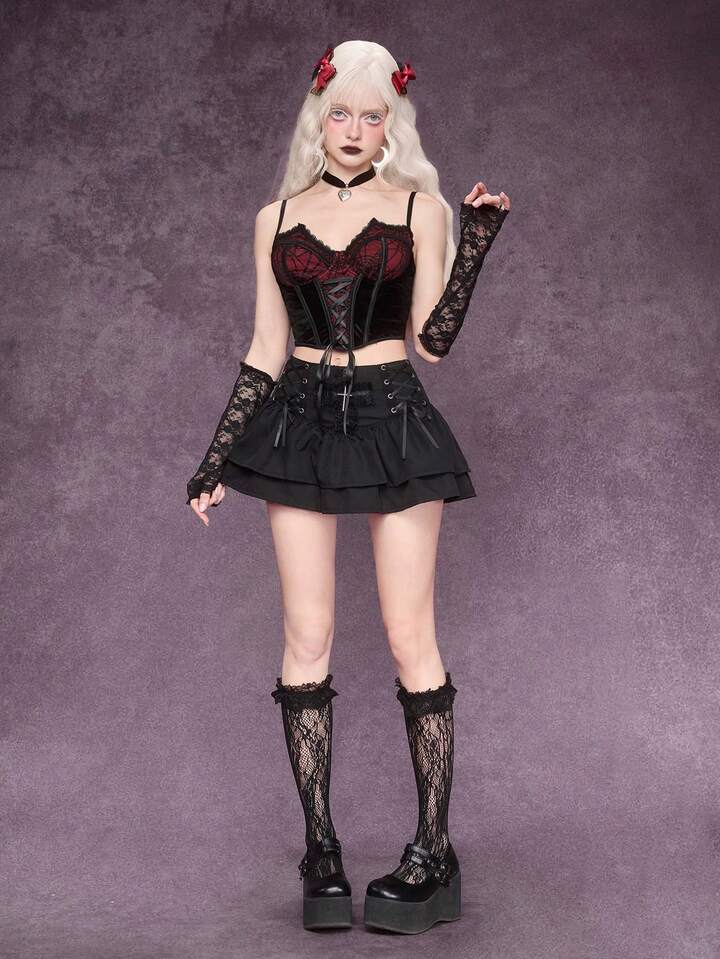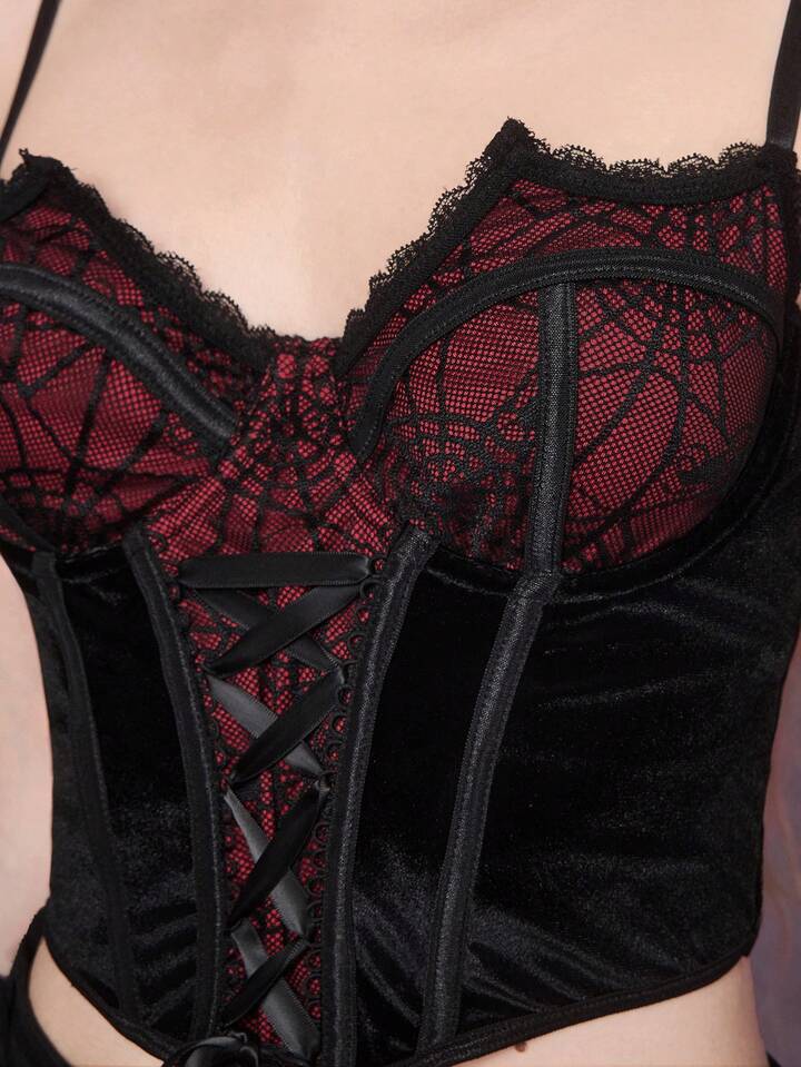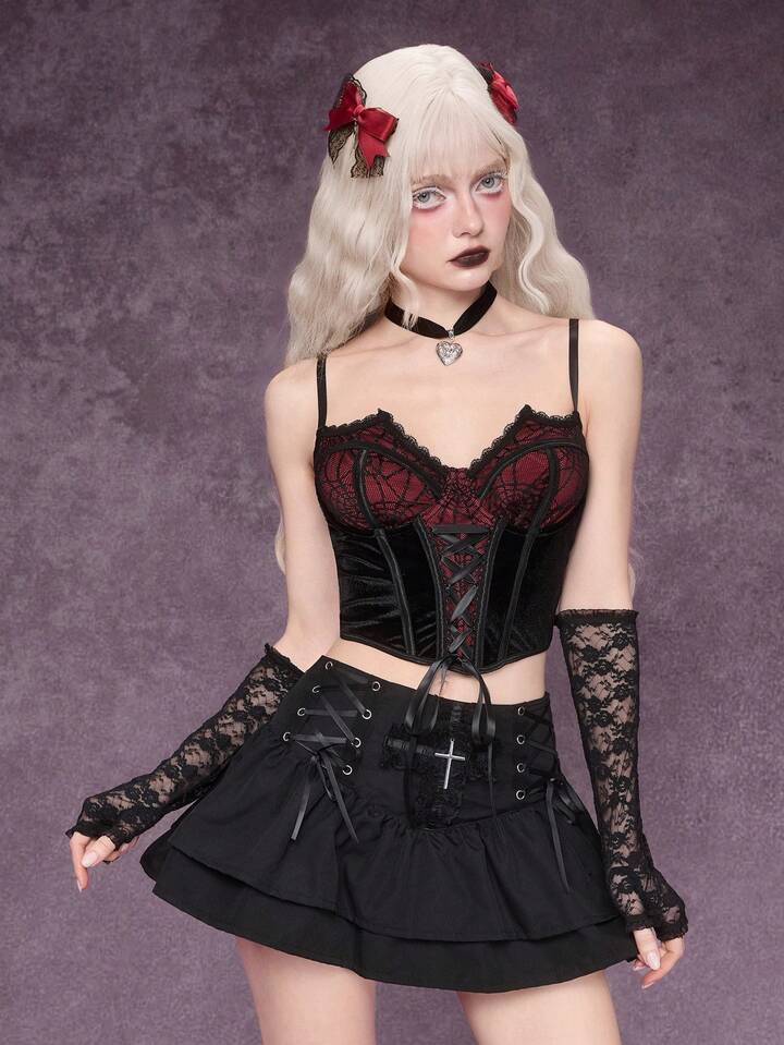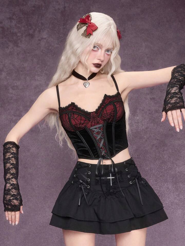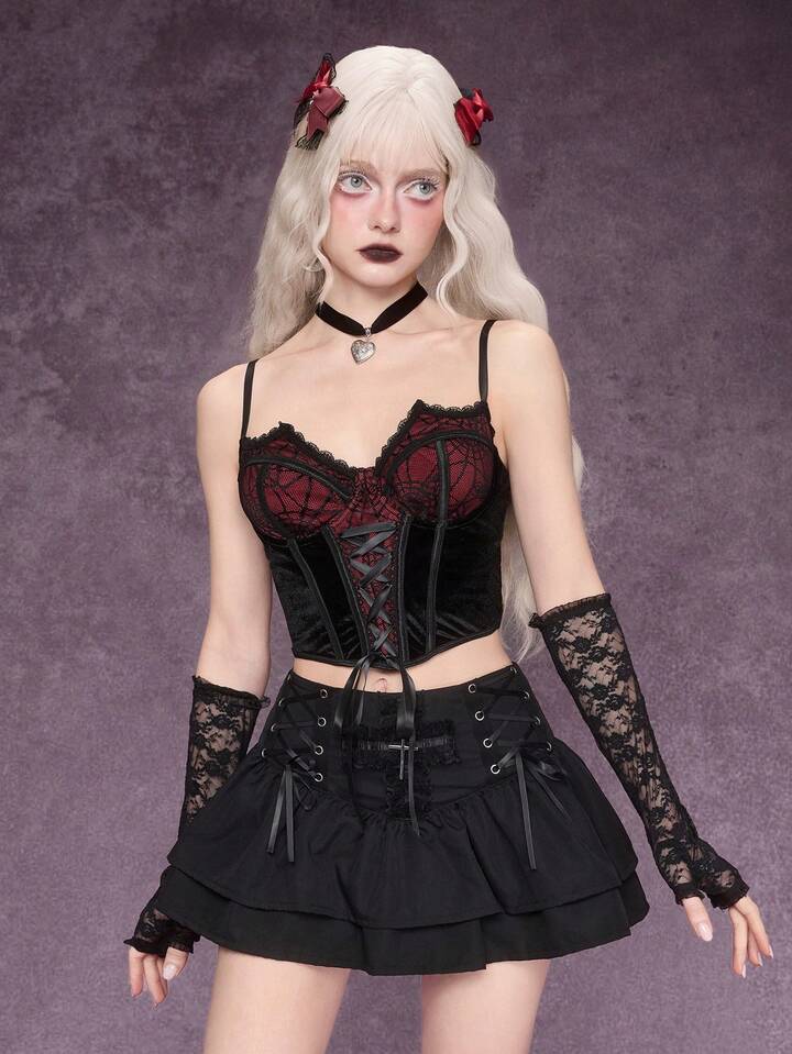 Goth Spider Web Lace Patchwork Asymmetrical Neckline Design Women Crop Top