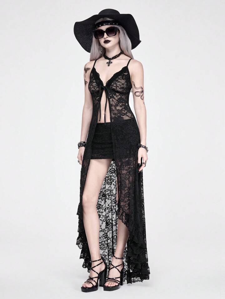 Goth Summer Vacation Lace See-Through Open Front Sleeveless Maxi Dress For Women