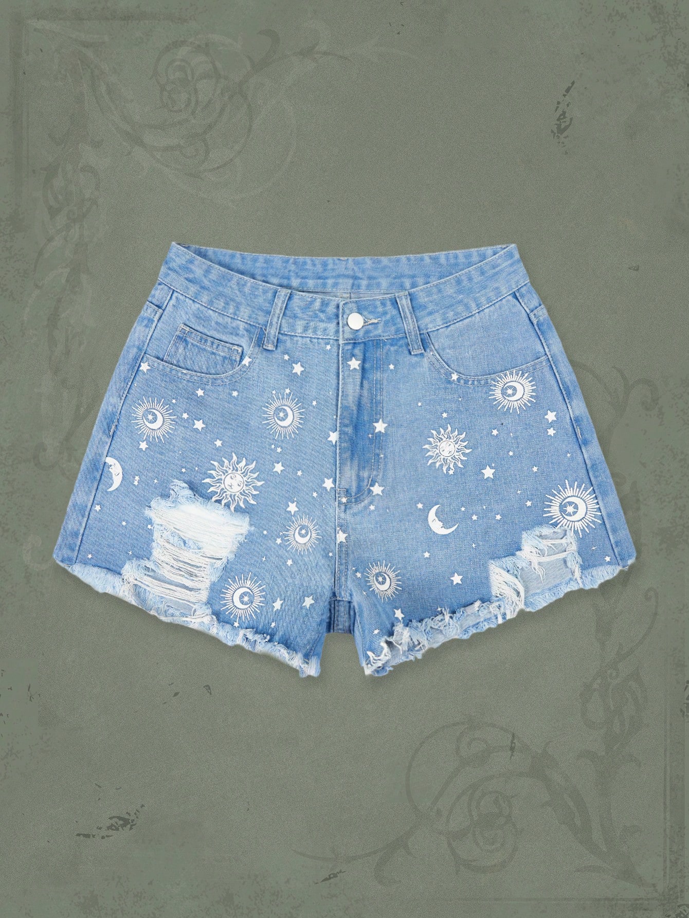 Goth Sun & Moon Graphic Ripped Denim Shorts