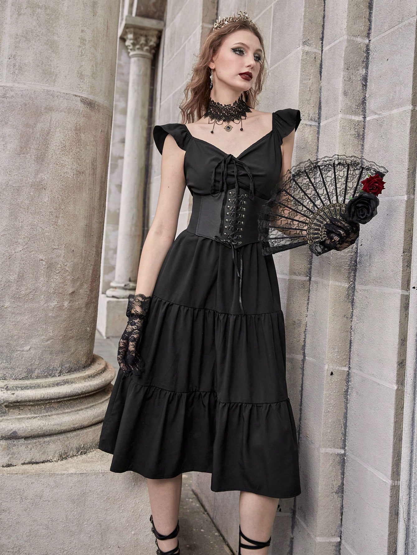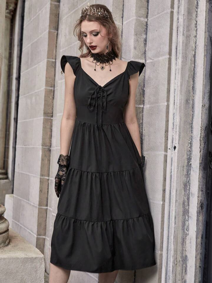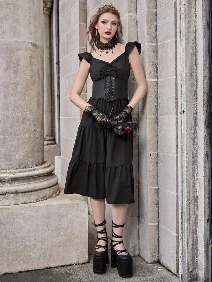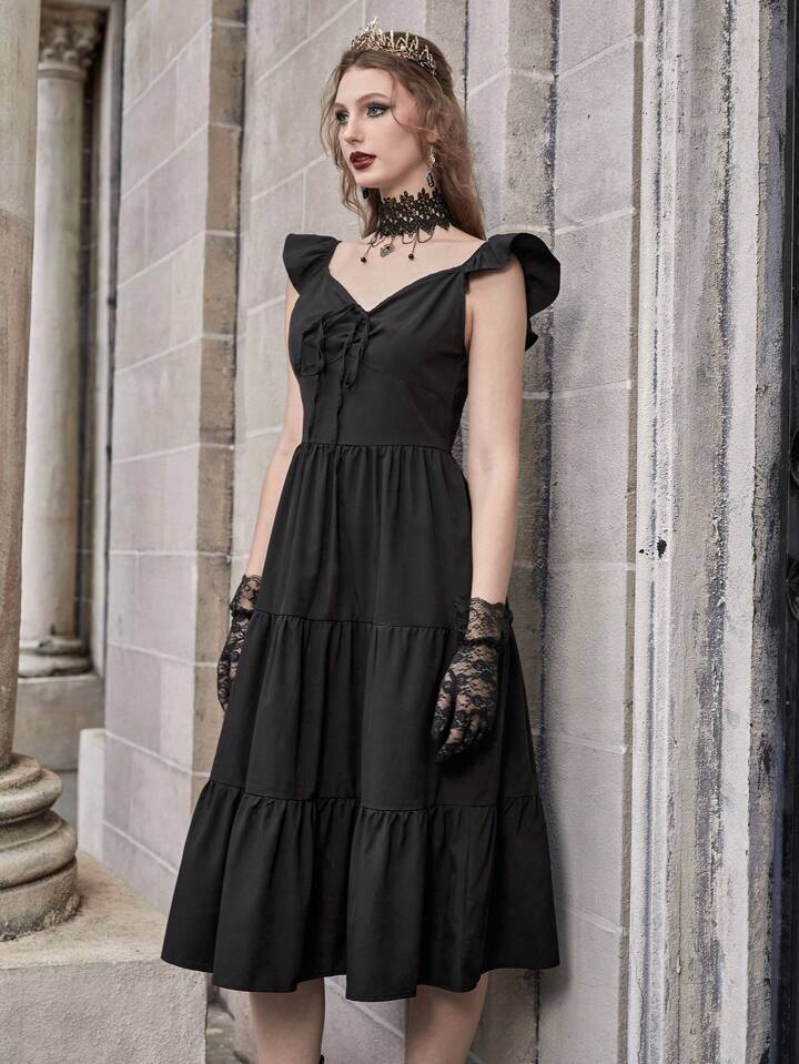 Goth Tie Front Ruffle Hem Dress