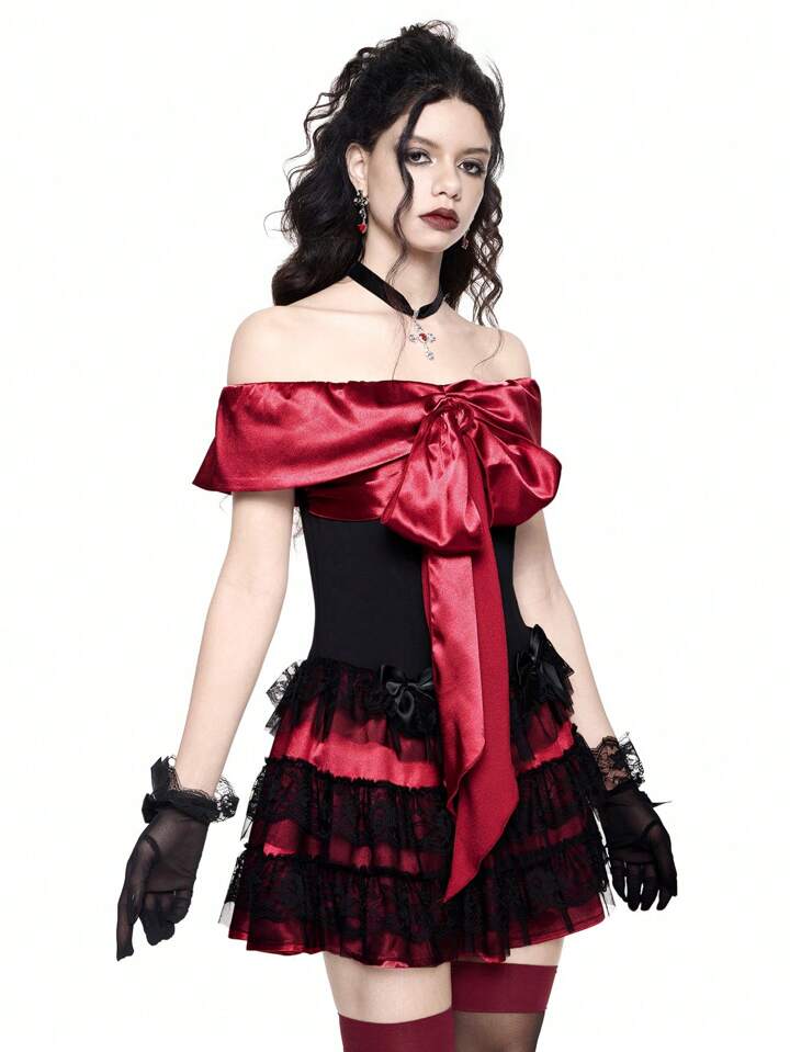 Goth Valentine's Day Off Shoulder Satin Bow & Lace Panel Glamorous Sexy Dress