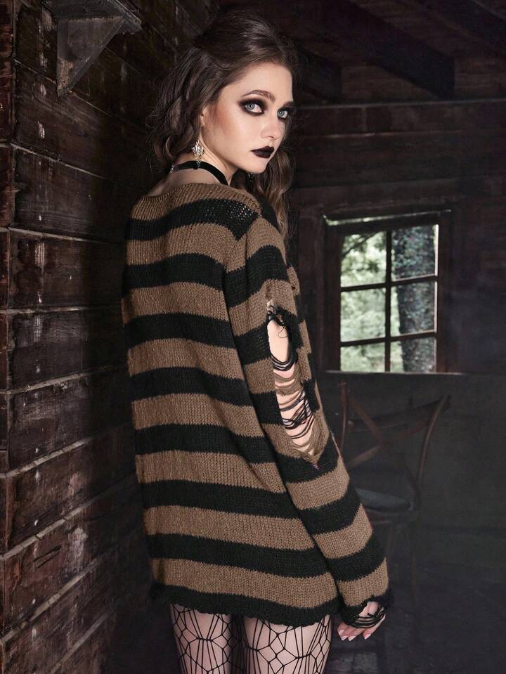 Goth Vintage Brown Striped Distressed Pullover Sweater