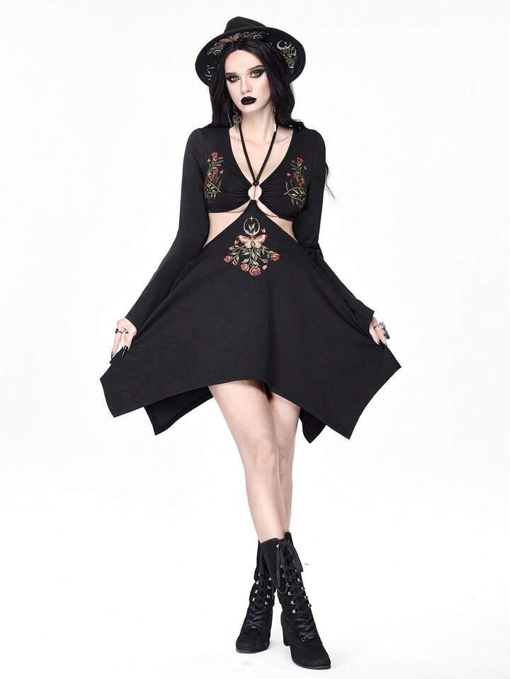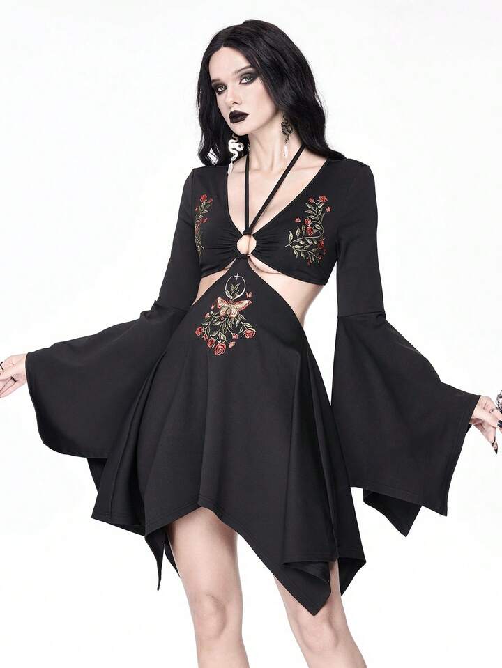 Goth Vintage Floral Butterfly Embroidery Hollow Waist Asymmetrical Hem Flare Sleeve Dress For Women