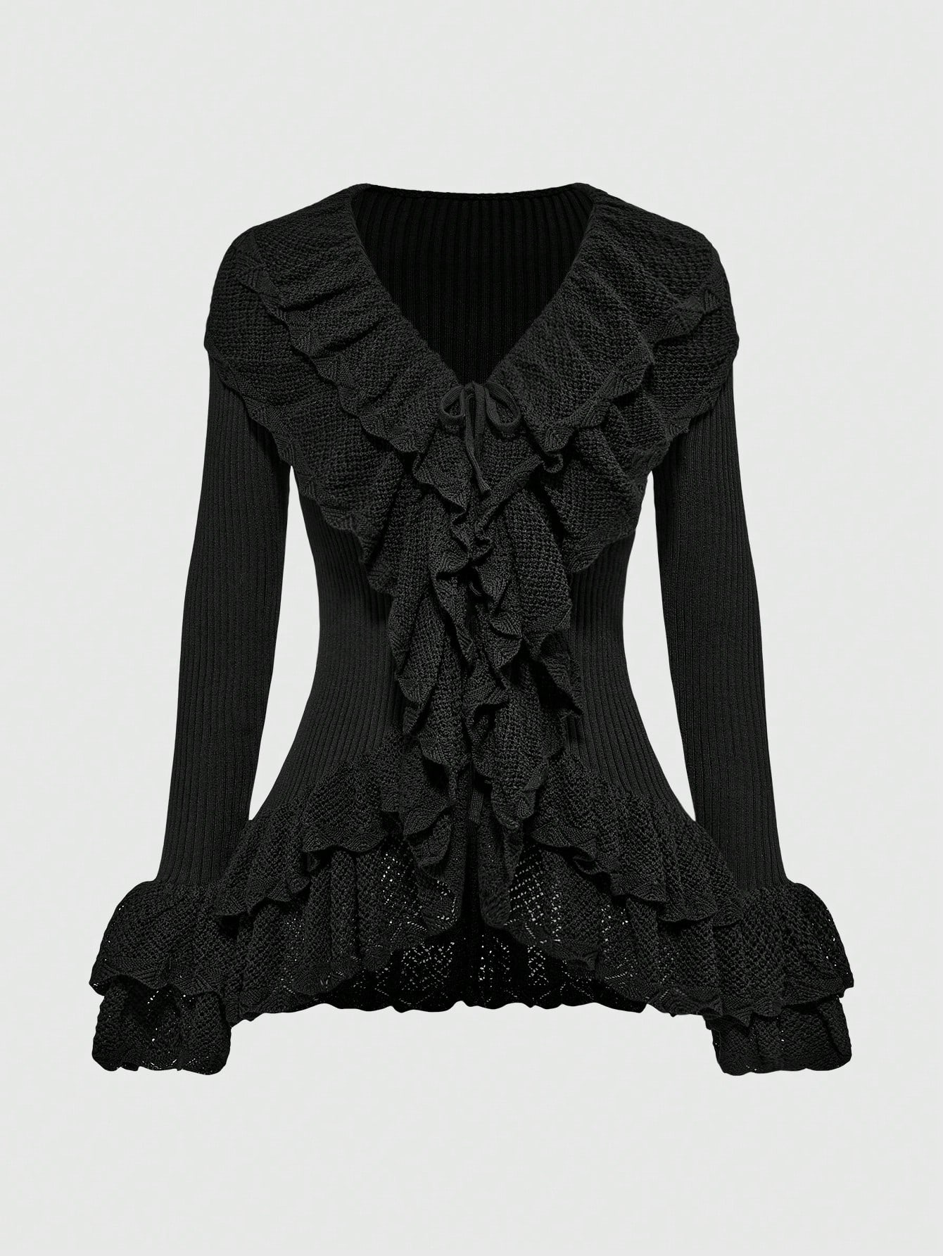 Goth Vintage Palace Style Elegant Layered Ruffle Trim Tie Waist Front Tie Cardigan