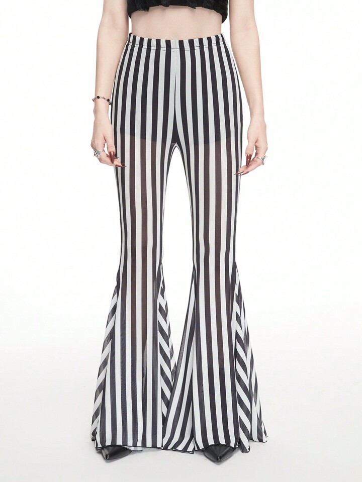 Goth Women Black And White Striped Holiday Style Wide Leg Mesh Flared Pants