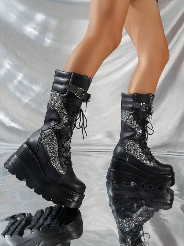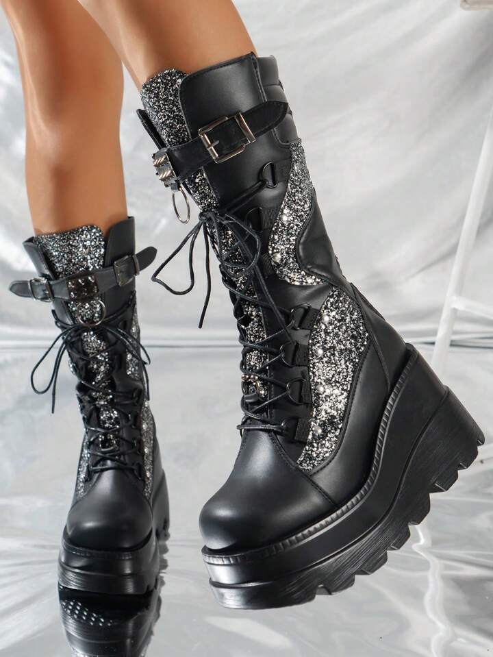 Goth Women Lace Up Glitter Mid-Calf Boots, Punk Outdoor Fashion Boots