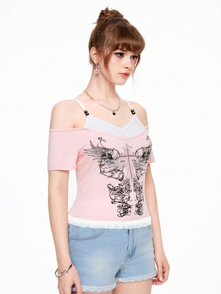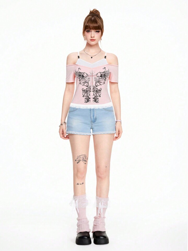 Goth Women Off Shoulder Backless Short Sleeve Floral Lace Trim Sweet T-Shirt