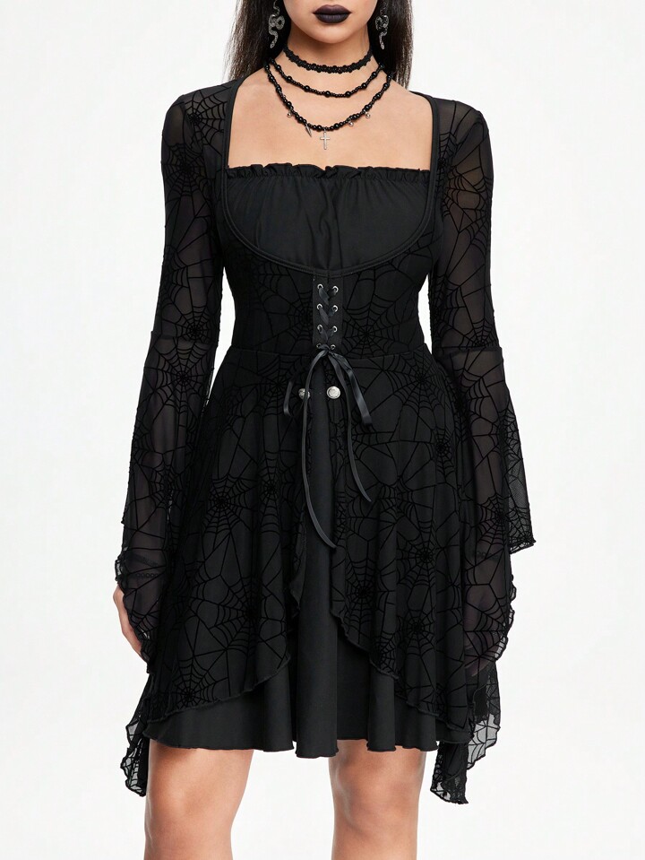Goth Women's Asymmetrical Hem Tie-Up Flare Sleeve Mini Dress With Spiderweb Textured Patchwork, Suitable For Halloween