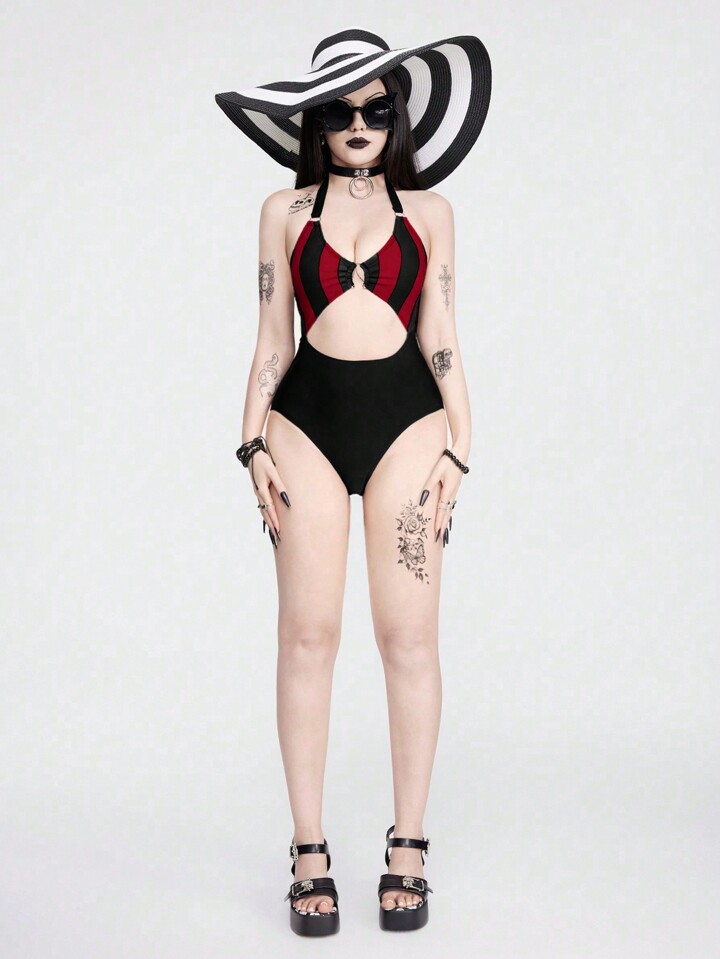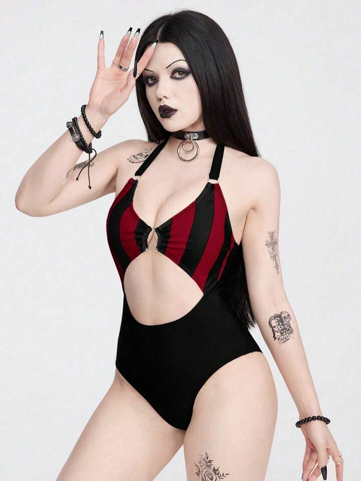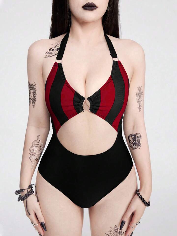 Goth Women's Black & Red Punk Rose Monokini, Hollow Out One-Piece Swimsuit, Casual For Spring/Summer Vacation, Beach, Party, Halloween