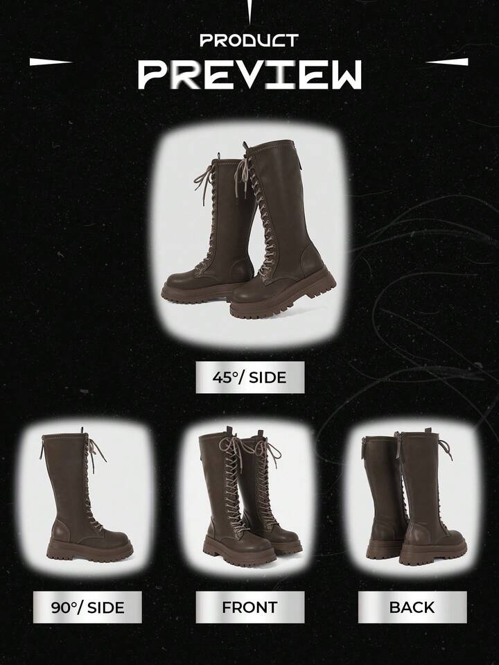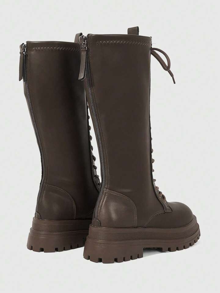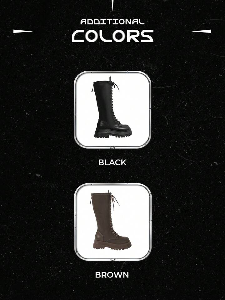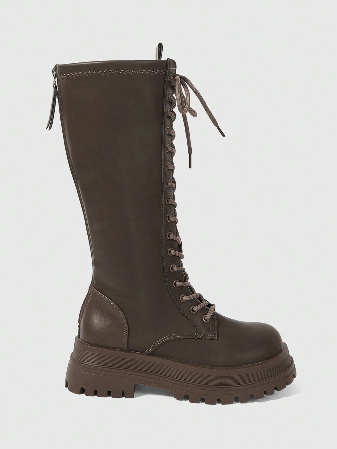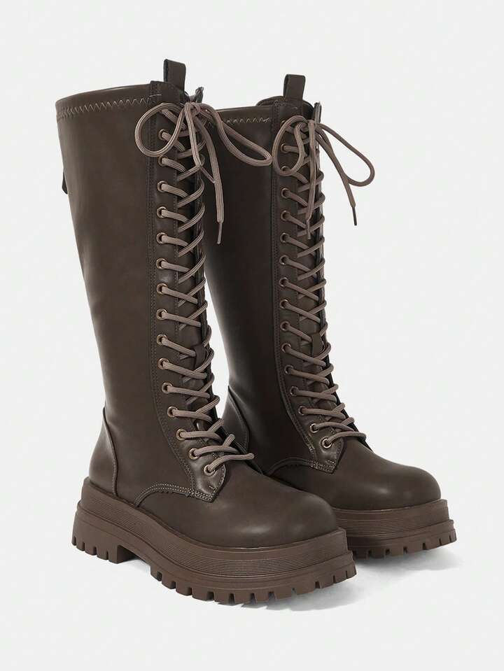 Goth Women's Brown Knee-High Boots Fashionable Lace-Up Thick-Soled Chunky Heel Women's Boots