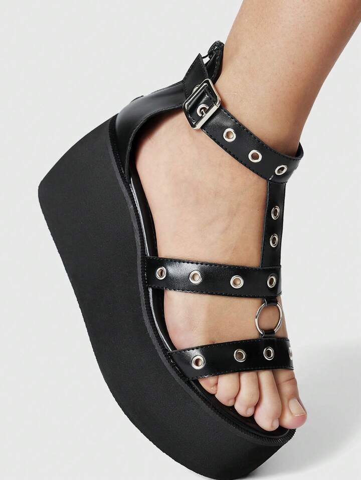 Goth Women's Button Decor Round Toe Thick Bottom Wedge Heel PU Leather Roman Sandals, Suitable For Graduation, Photography, Casual Wear, Black Spring Shoes Spring Break Easter