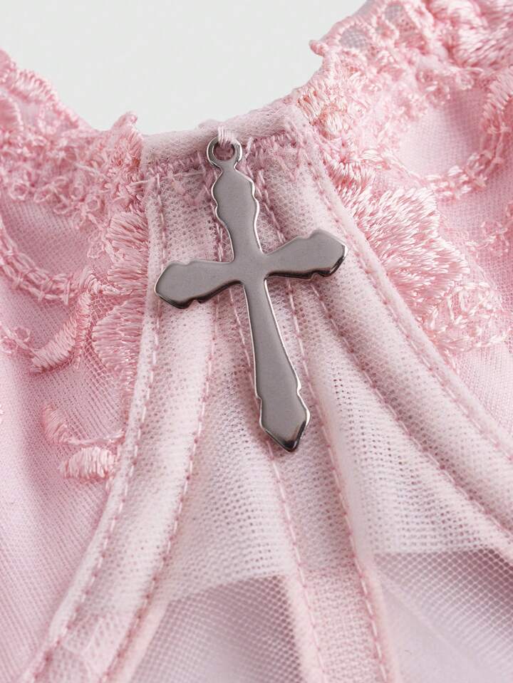 Goth Women's Cross Metal Decor Pink Floral Embroidery Camisole