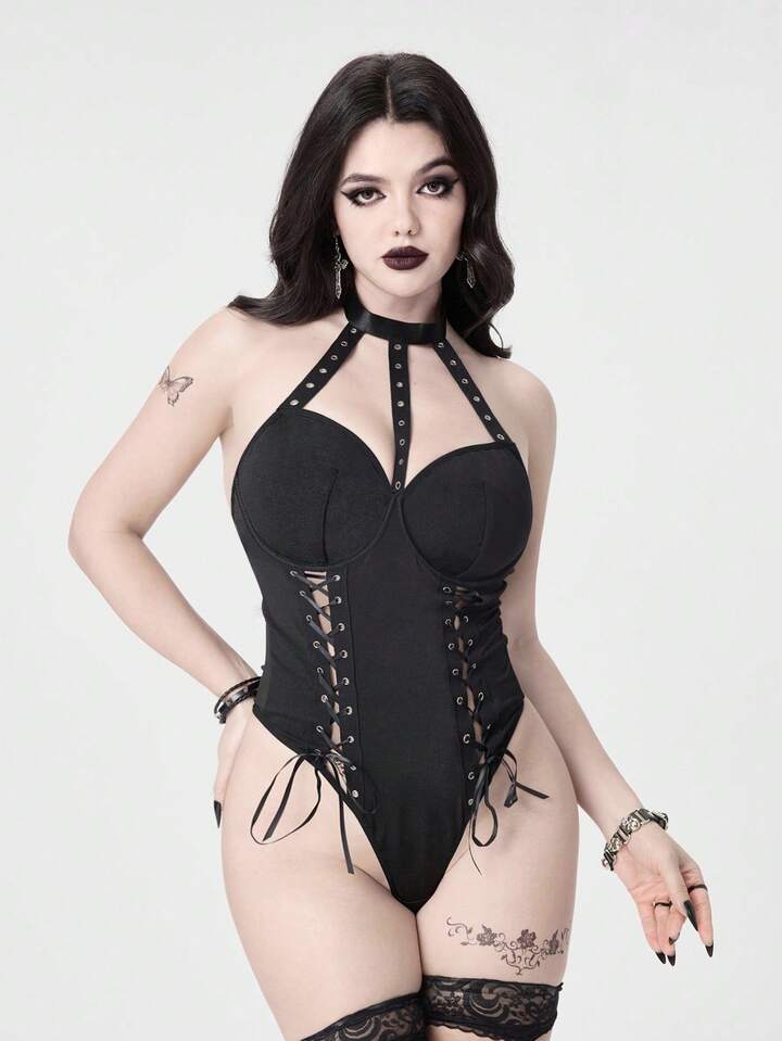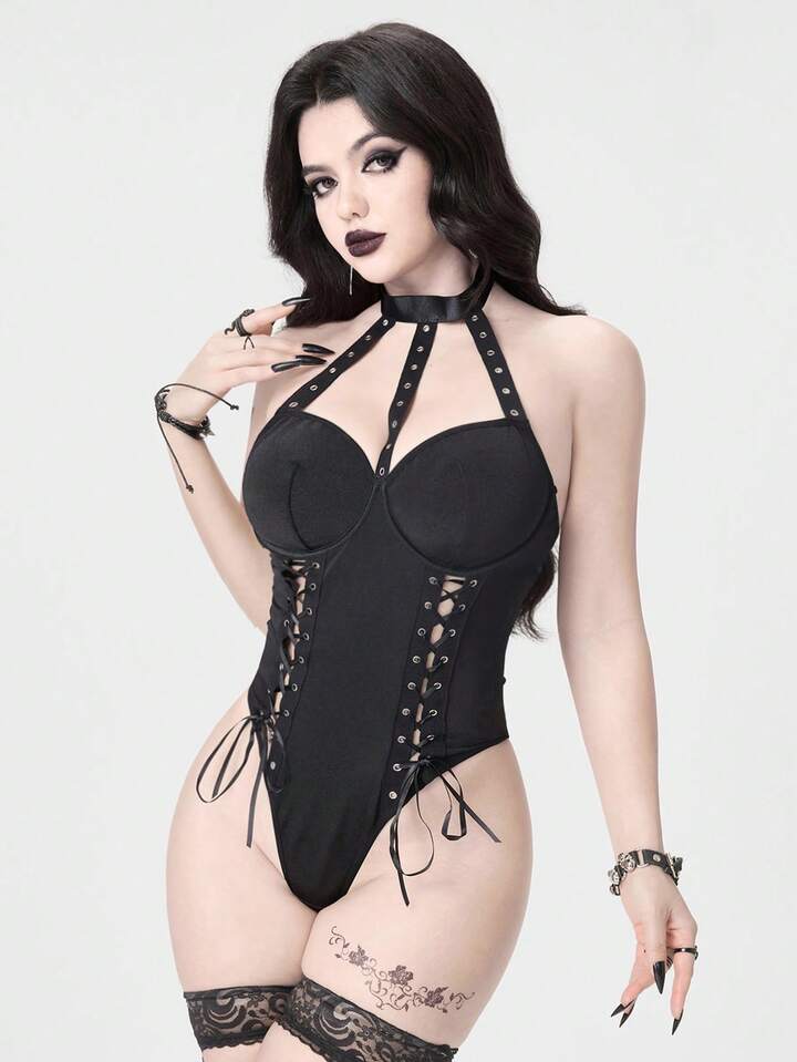 Goth Women's Dark Punk Eyelet Lace-Up Halter Sexy Bodysuit