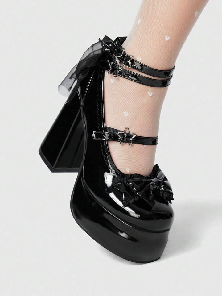 Goth Women's Mary Jane Platform Pumps With Thick Heel, Bowknot Shoes, Round Toe Mule Pumps, Black Formal Dress High Heels Spring Shoes Spring Break Easter Prom Heels