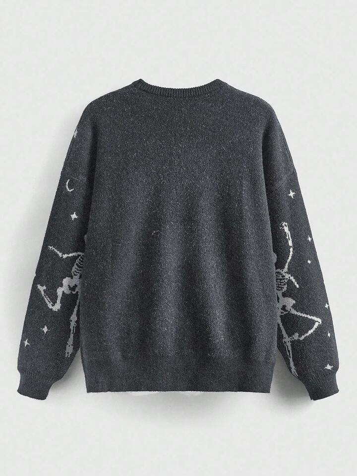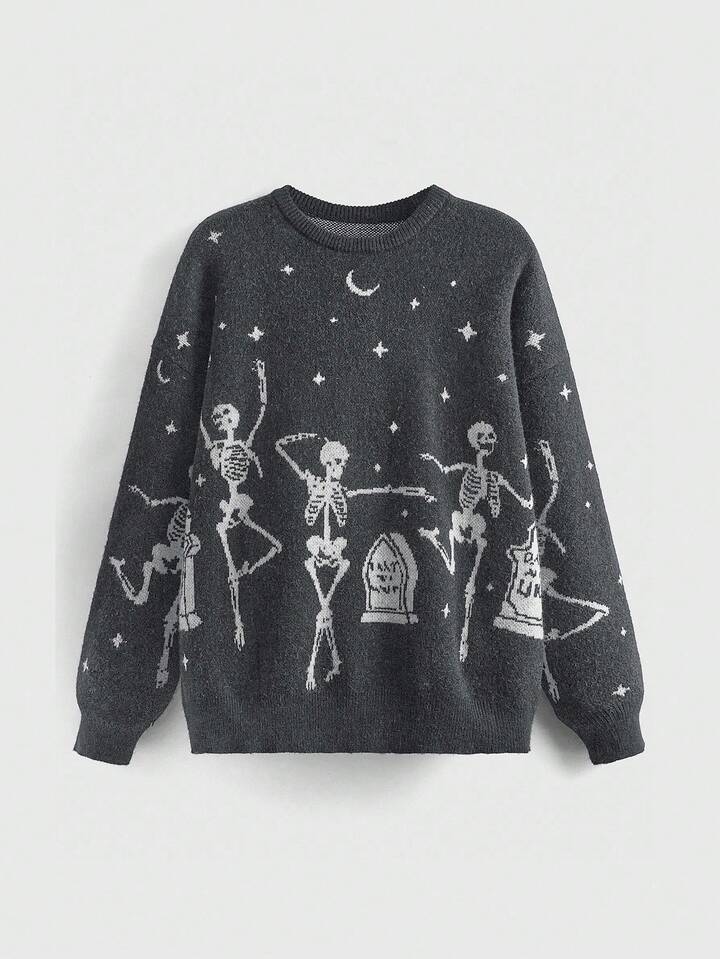 Goth Women's Retro Halloween Skeleton Jacquard Basic Crew Neck Loose Pullover Sweater, Unisex