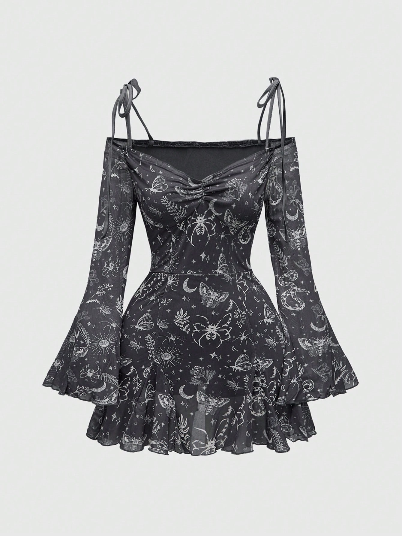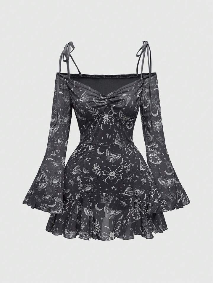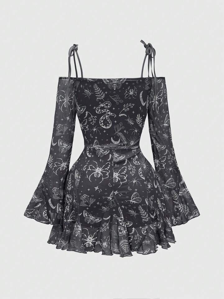 Goth Women's Sexy Off Shoulder Butterfly Spider Insect Floral Allover Print Cami Dress
