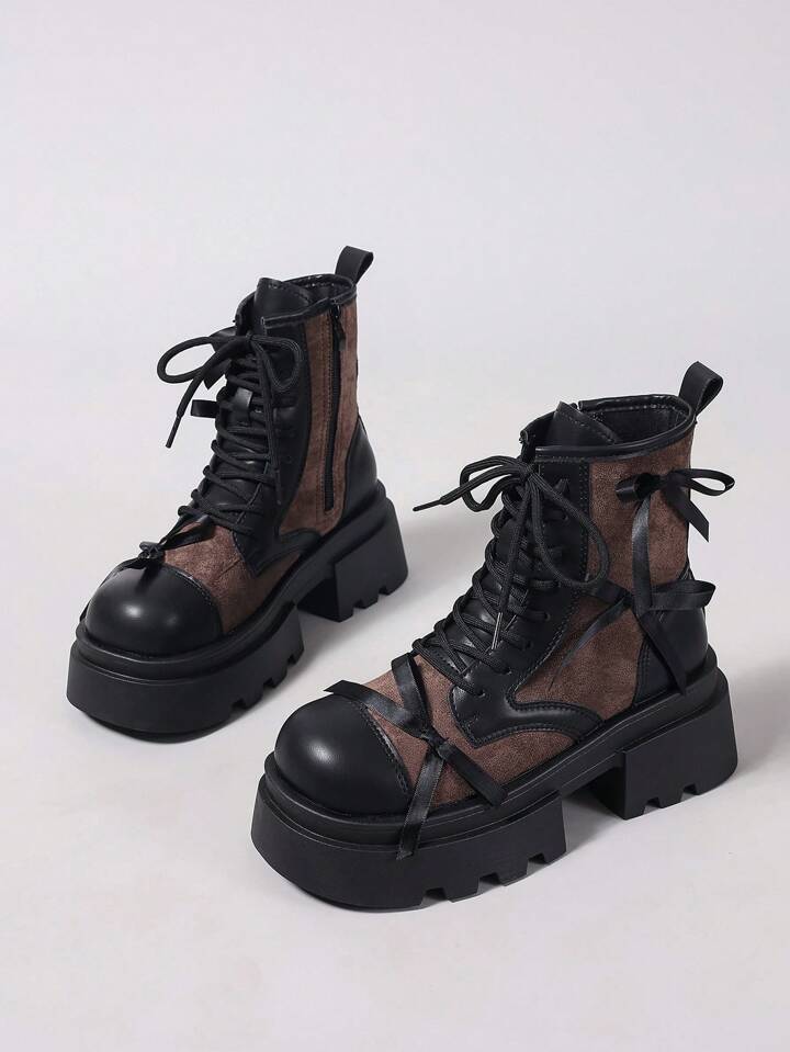 Goth Women's Sweet & Cool Platform Boots, New Arrival Spring/Autumn, British Style Black Round Toe Canvas Bow Lace-Up Short Ankle Boots Valentine's Day